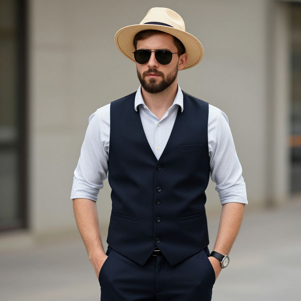 "man hocus pocus costume, 1boy, male focus, solo, facial hair, brown footwear, pants, shirt, hat, hand in pocket, full body, vest, white shirt, striped socks, beard, standing, black pants, socks, grey background, mustache Realistic photo of casual sexy person with pretty face"