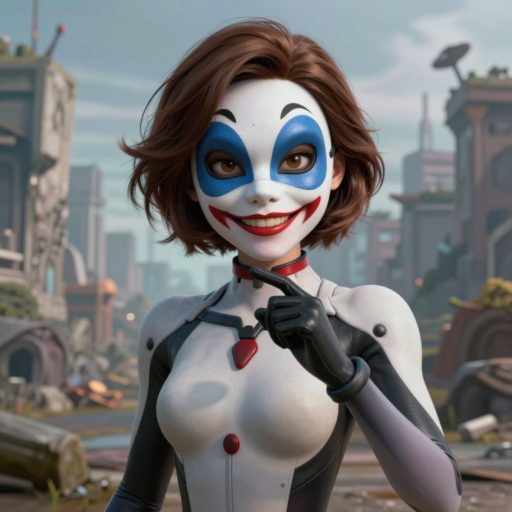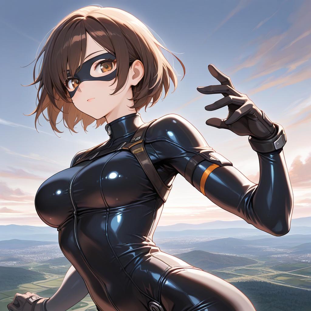 (masterpiece:1.2), (best quality), (ultra detailed), (8k, 4k, intricate), (full-body-shot:1), (highly detailed:1.2), (detailed face:1.2), (detailed background), detailed landscape, (dynamic pose:1.2), 1girl, solo, smile, short hair, brown hair, gloves, brown eyes, bodysuit, mask, domino mask, upper body, portrait