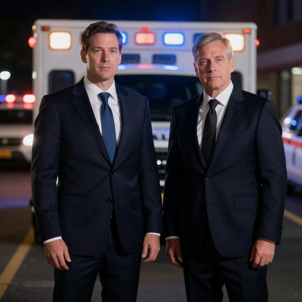 Photograph of two serious men in dark suits and ties standing in front of a brightly lit ambulance at night. The man on the left has short brown hair, while the man on the right has gray hair. Background includes blurred police car lights and a dark urban setting.