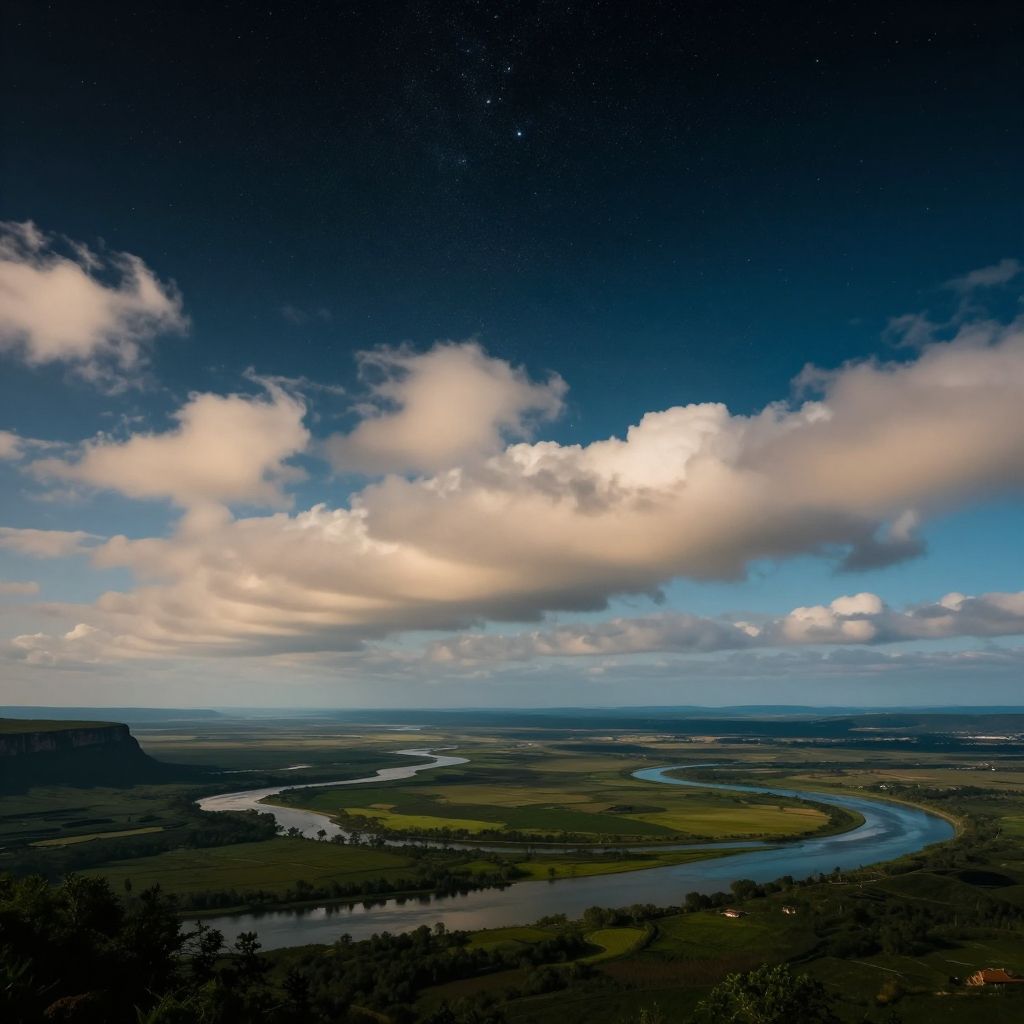 Photograph of a serene landscape at dusk, featuring a winding river, green fields, dark silhouette of a cliff, and a starry, cloud-filled