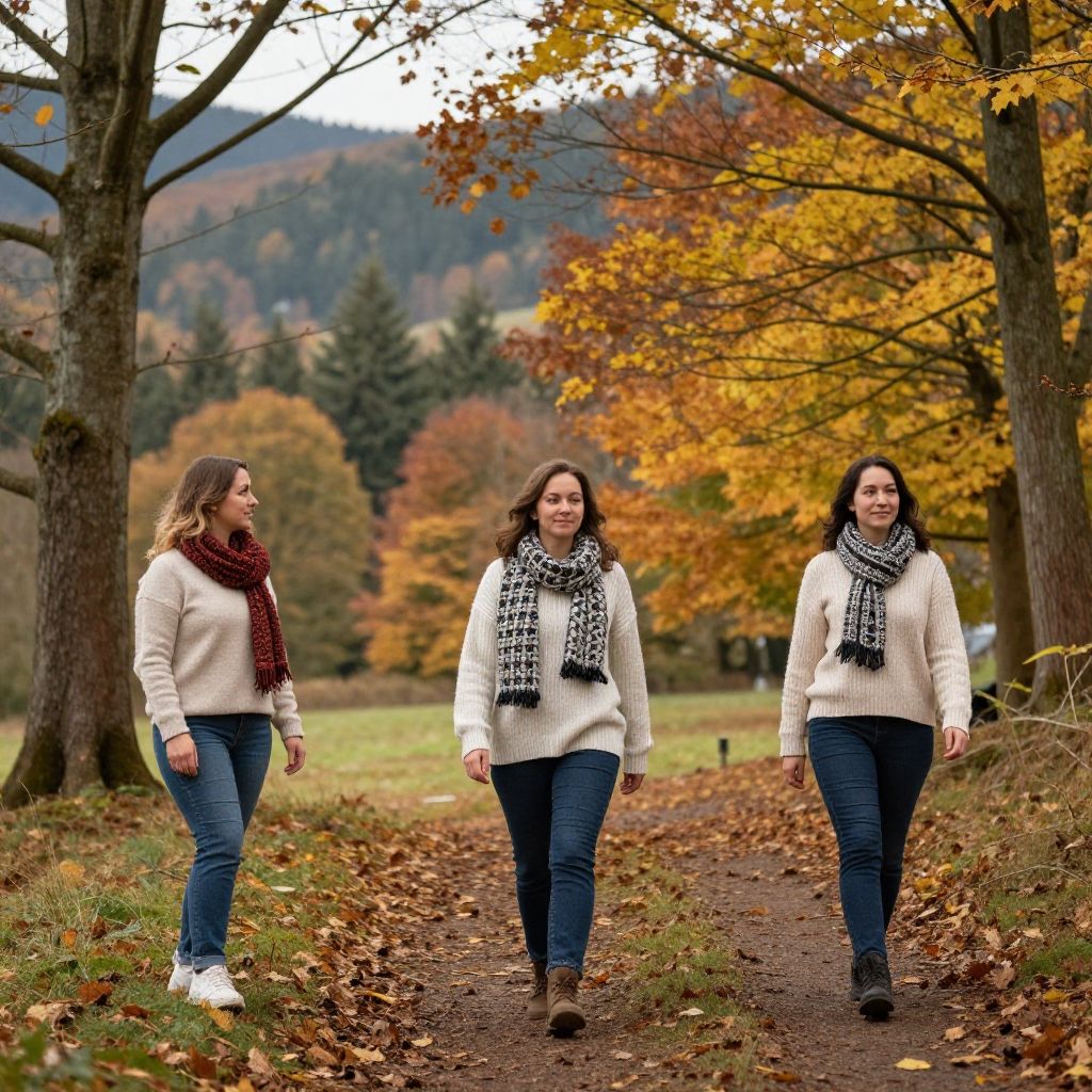 Curvy German women enjoying a scenic autumn day in the Black Forest, wearing cozy sweaters and scarves, surrounded by colorful foliage, cinematic depth, warm tones