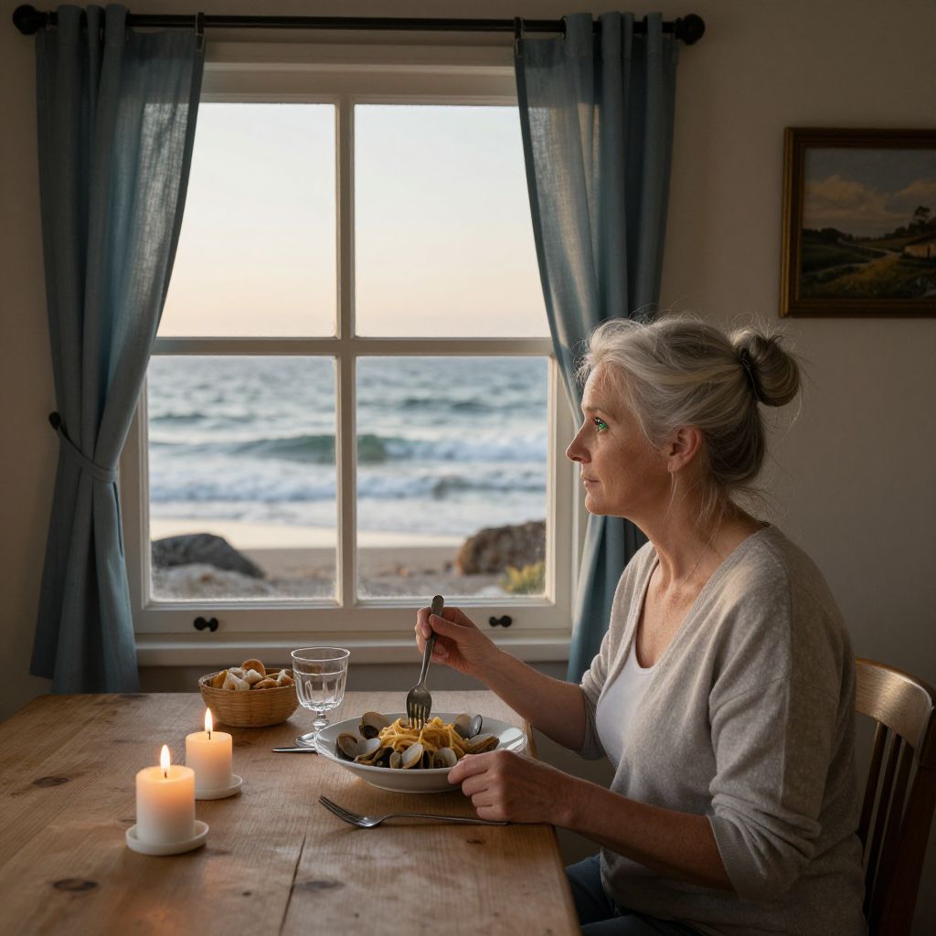 A quiet seaside dinner in a small seaside cottage with a sea view, a middle-aged woman with silver hair pulled into a bun and calm green eyes is eating a bowl of clams and pasta near a window. The room has faded blue curtains, a wooden table with candles, and a view of the ocean beyond. Soft waves are visible through the glass, and the evening light is golden and peaceful.