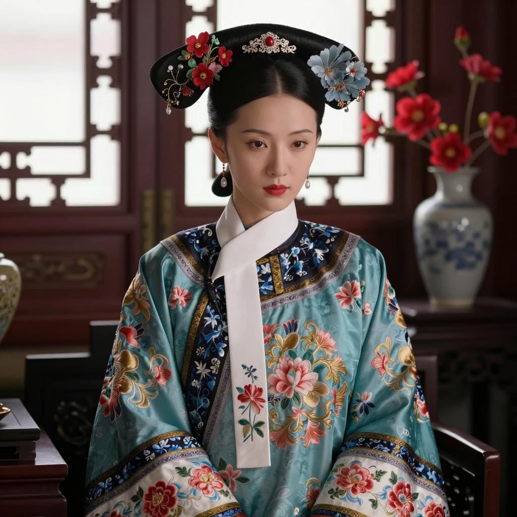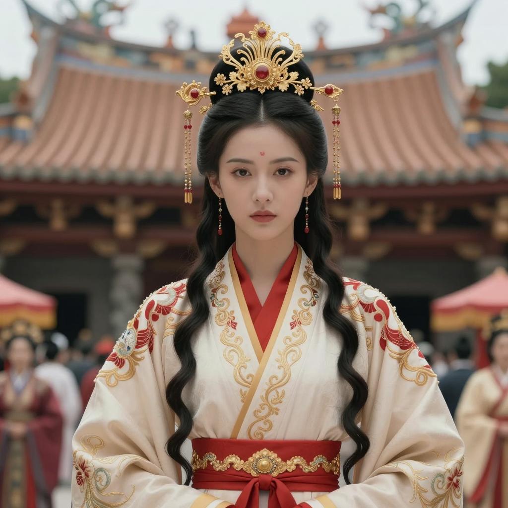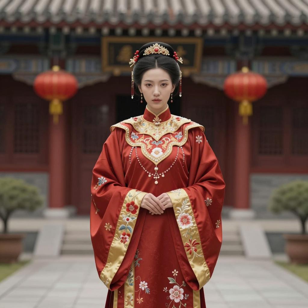 Mandarin costume, photo of Asian woman, traditional Chinese attire, orange silk qipao with red trim, large ornate red and gold paper parasol, black hair in an updo, standing on a traditional Chinese street, blurred background with red lanterns and buildings, confident expression, hands crossed, daytime, realistic, digital photo, cultural, elegant, festive, traditional fashion