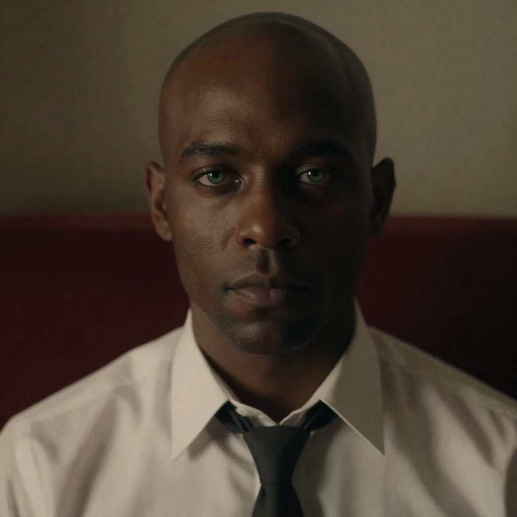 (masterpiece), (extremely intricate:1.3), (realistic), beautiful lighting, professional lighting, film grain, portrait of morpheus, male focus, solo, realistic, bald, looking at viewer, green eyes, blurry, dark skin, formal, shirt, closed mouth, necktie, red chair
