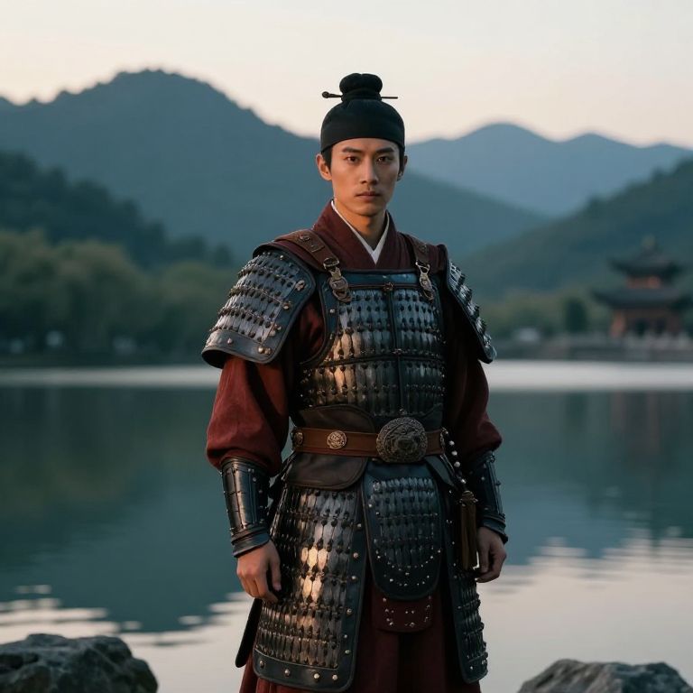 A striking portrait of a warrior in traditional armor standing by a serene lake at dawn. This image showcases a historic atmosphere with lush mountains in the background and hints of ancient architecture, capturing the essence of a bygone era in a visually captivating style.