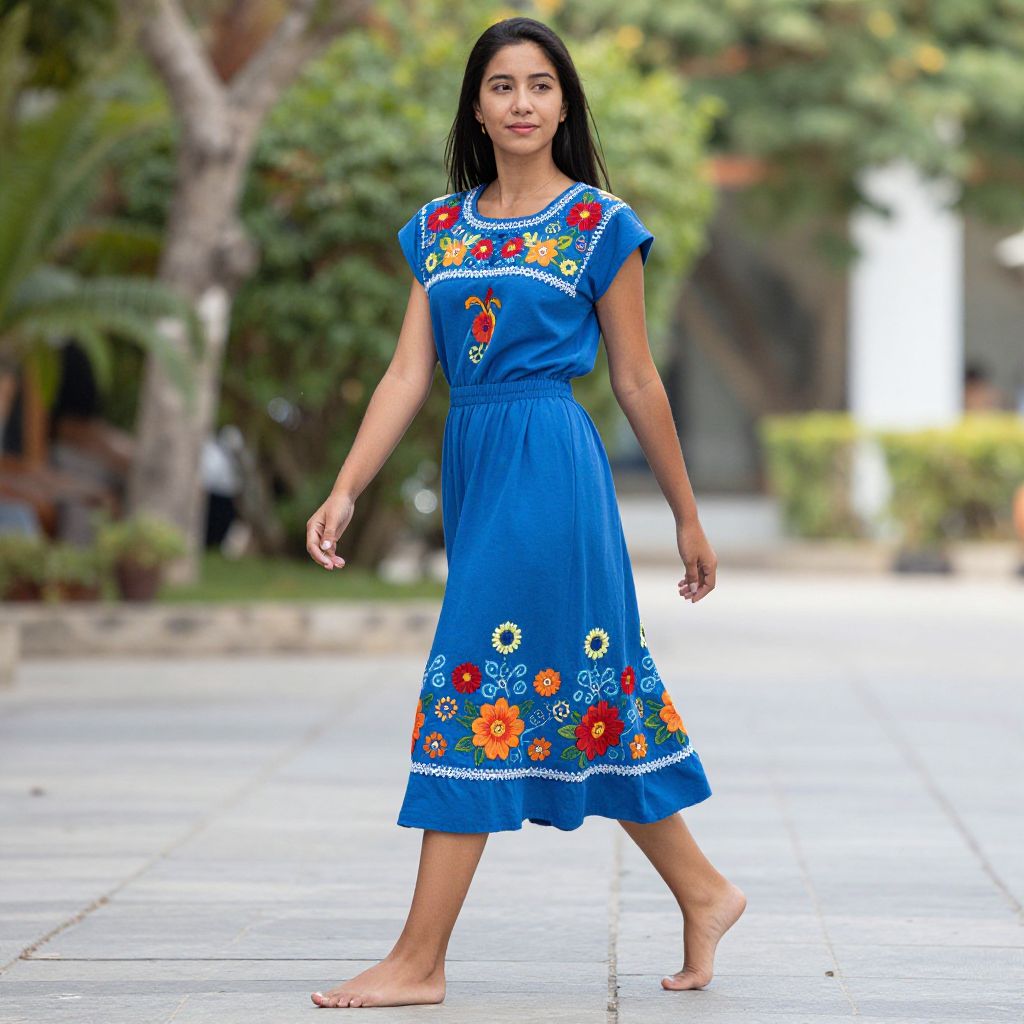 Photo of a young woman walking barefoot outdoors wearing a blue Old Mexico dress with colorful floral embroidery.