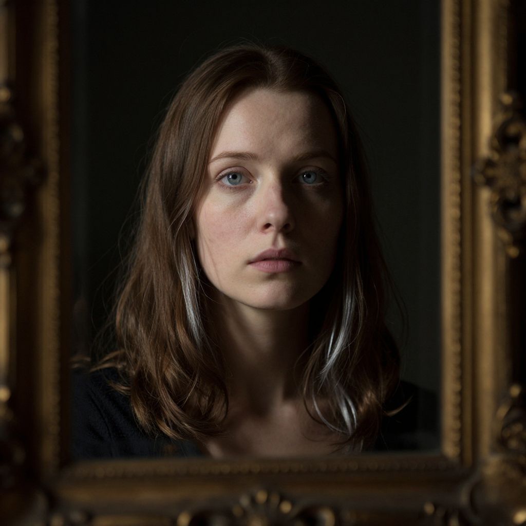 Craft a photorealistic portrait of a melancholic woman with captivating features, illuminated by Rembrandt's iconic chiaroscuro lighting technique. Her chestnut-brown hair, adorned with silver strands, falls gracefully over her shoulders. Hazy blue eyes exude deep thought and introspection, reflecting the dappled light from a nearby window that casts subtle shadows across her face. The ornate, gilded mirror frames this solitary scene, set in a dimly lit study, inviting viewers to delve into the complexities of her inner world.