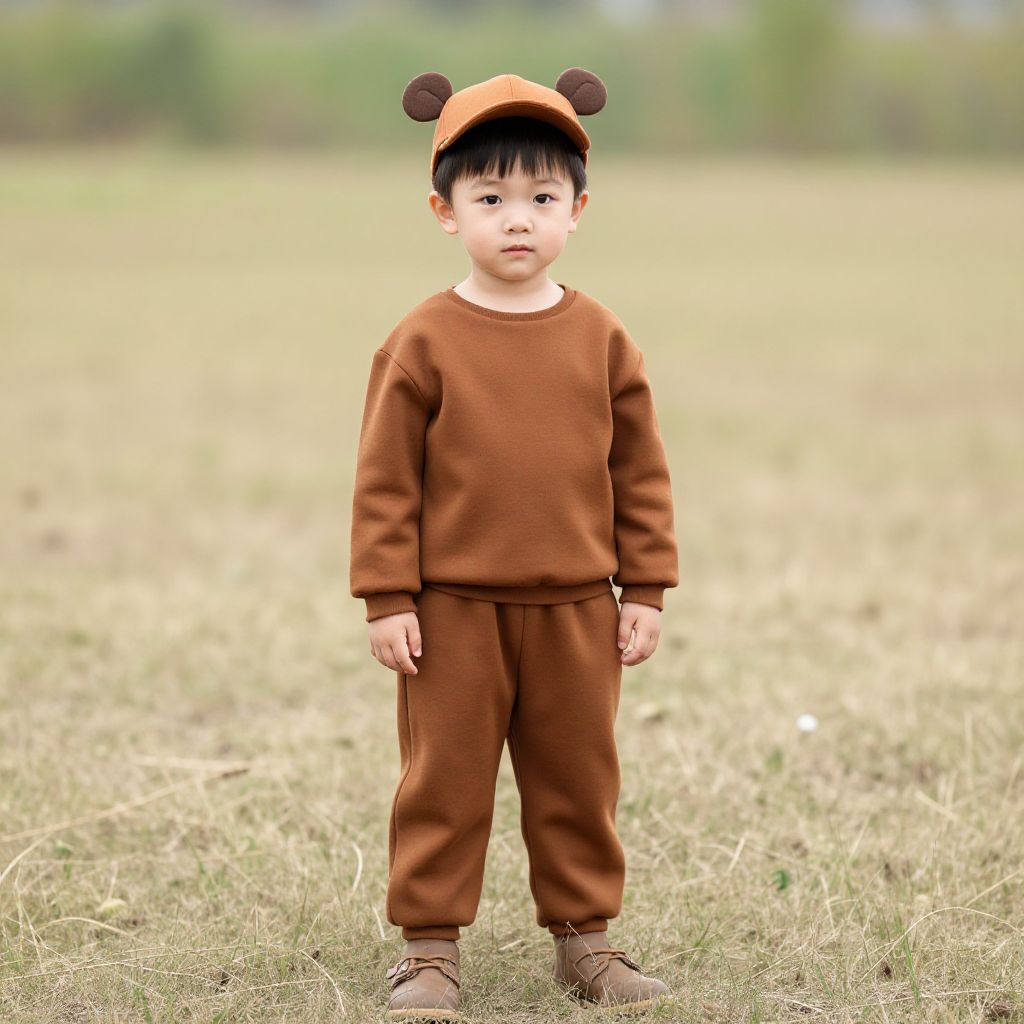 Photograph of an Asian toddler standing in a grassy field, wearing a brown onesie with long sleeves and matching brown pants. The child has short black hair and is wearing a brown hat with two brown bear ears on top. The toddler's expression is neutral, and he is wearing brown shoes. The background is blurred with green and brown hues, suggesting a natural outdoor setting. The grass appears slightly dry, and the overall lighting is soft and natural. The child is centered in the image, standing with arms slightly away from his body.