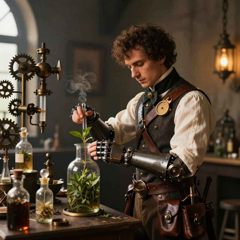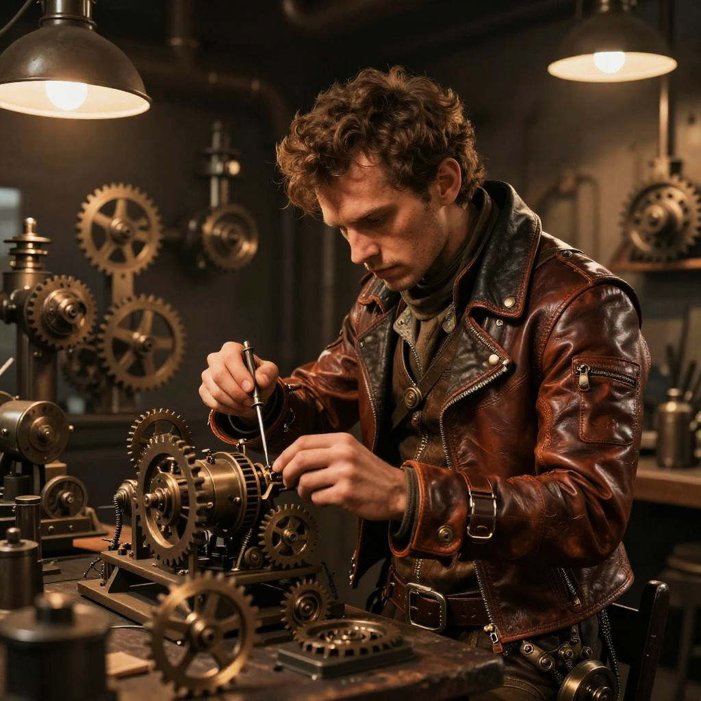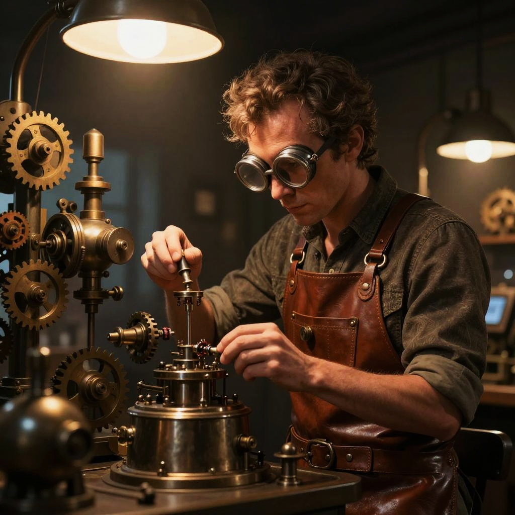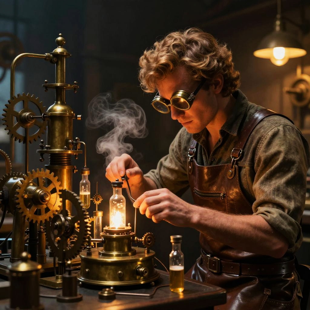 Steampunk Engineer in Busy Workshop