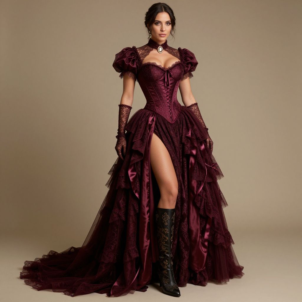 Full body shot, toned woman, corset-inspired Victorian dress, deep burgundy silk corset, intricate lace detailing, puffed sleeves, flowing floor-length skirt, layered tulle underskirt, delicate satin ribbon accents, high lace collar, vintage brooch at neckline, lace-up back, ankle-length lace gloves, knee-high leather boots, ornate floral patterns, rich velvet fabric, dramatic train, elegant silhouette, romantic and regal atmosphere Sexy. Pretty face and beаutiful eyes. Big breasts
