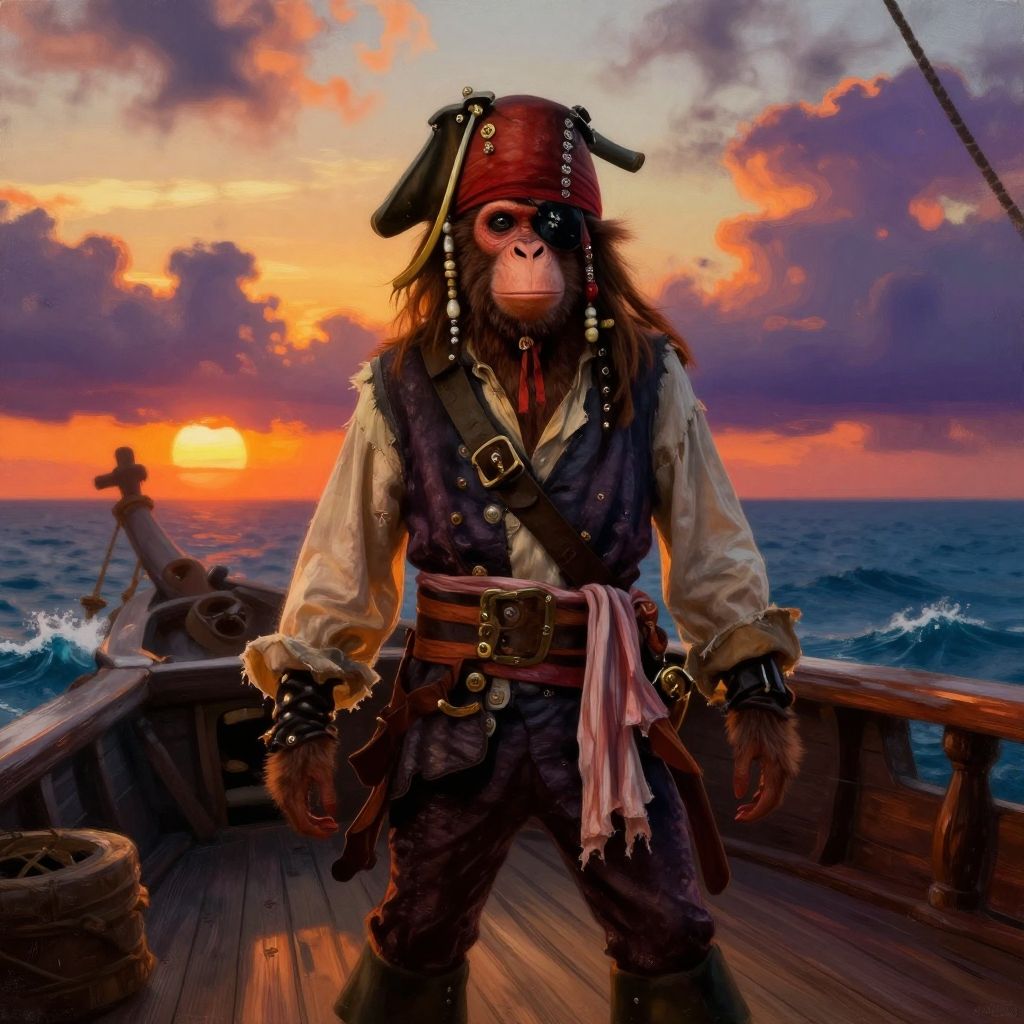 Digital artwork of a pirate with monkey face, wearing a red hat, eye patch, and tattered clothes, standing on a wooden ship deck at sunset