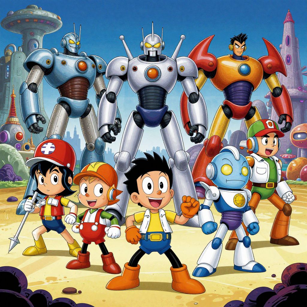 Cartoon mashup drawing portraying a creative mix of beloved childhood cartoon characters and sci-fi robot warriors, high contrast colors, smooth gradients, dynamic battle scene in an alien landscape, detailed armor and character features, blending nostalgic charm with futuristic intensity