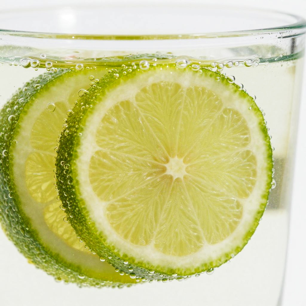 A close-up photograph of a glass filled with green lime slices and water bubbles. The lime slices are vibrant green with a white, juicy interior. The glass is clear, showing the lime slices through it. Tiny water bubbles are scattered across the surface, giving a refreshing, fizzy effect. The background is a bright white, making the lime slices and bubbles pop.