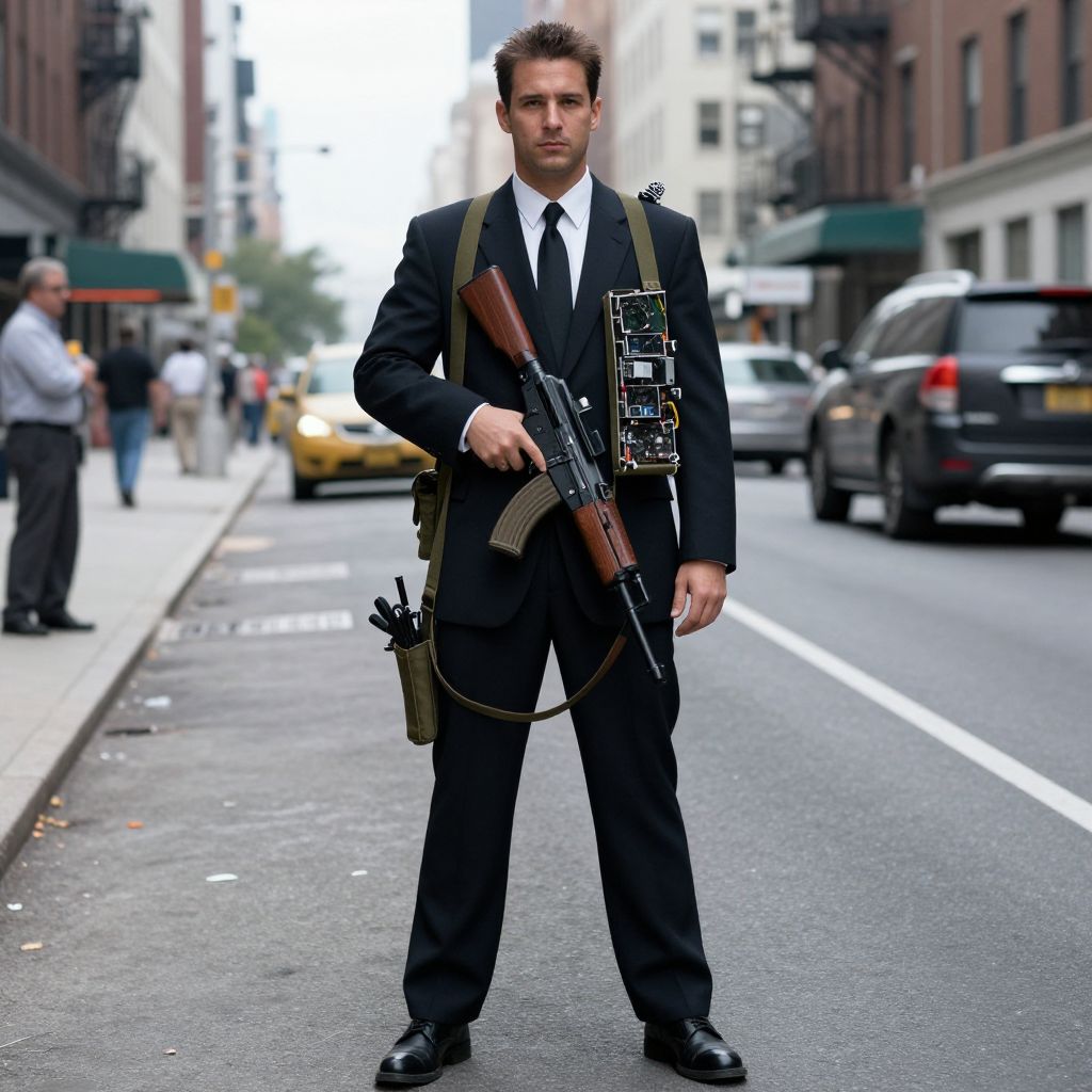 A 90s photograph of a full body man in a suit mixed with a soldier wearing a satchel of computer parts and a few cables holding an assault rifle standing in a nyc street