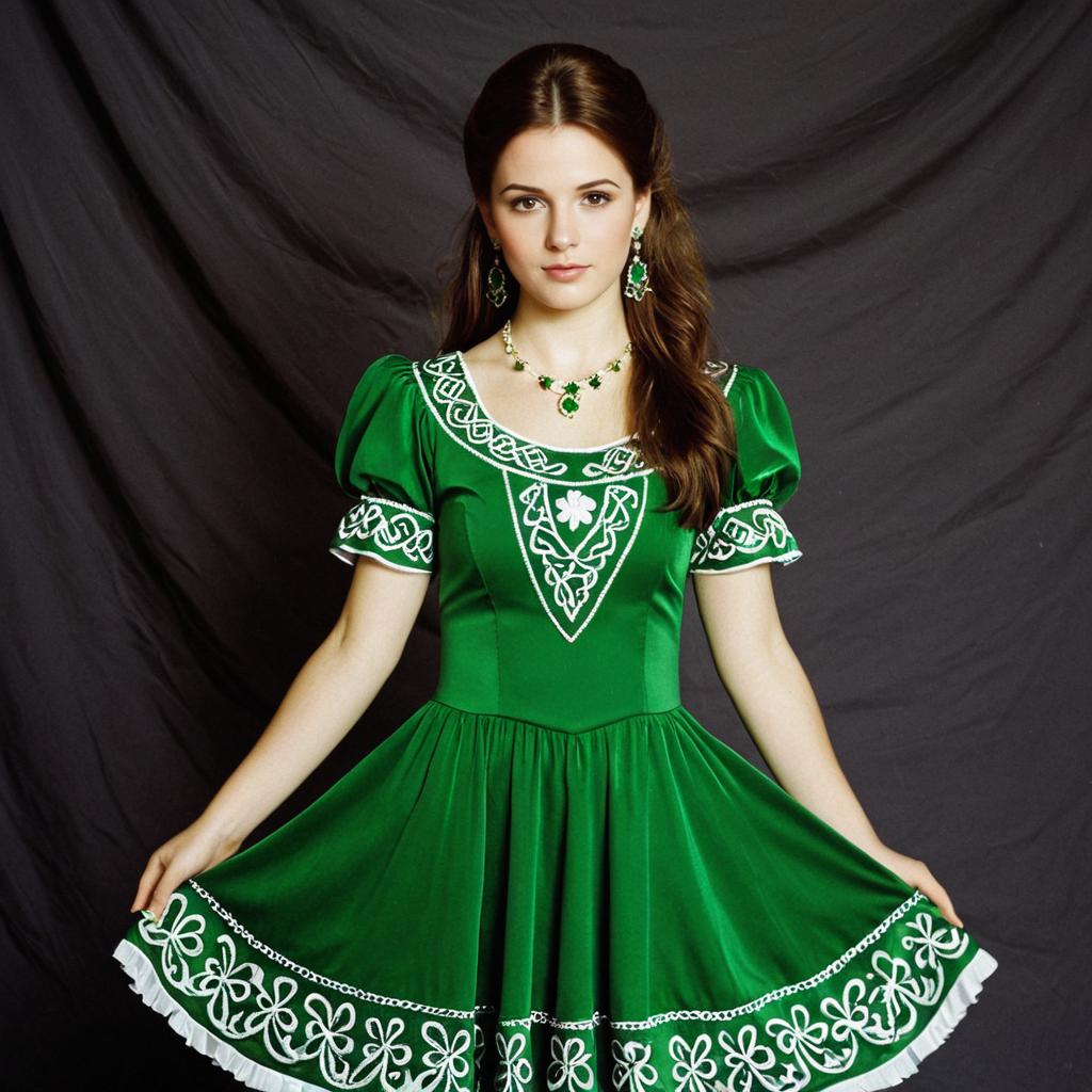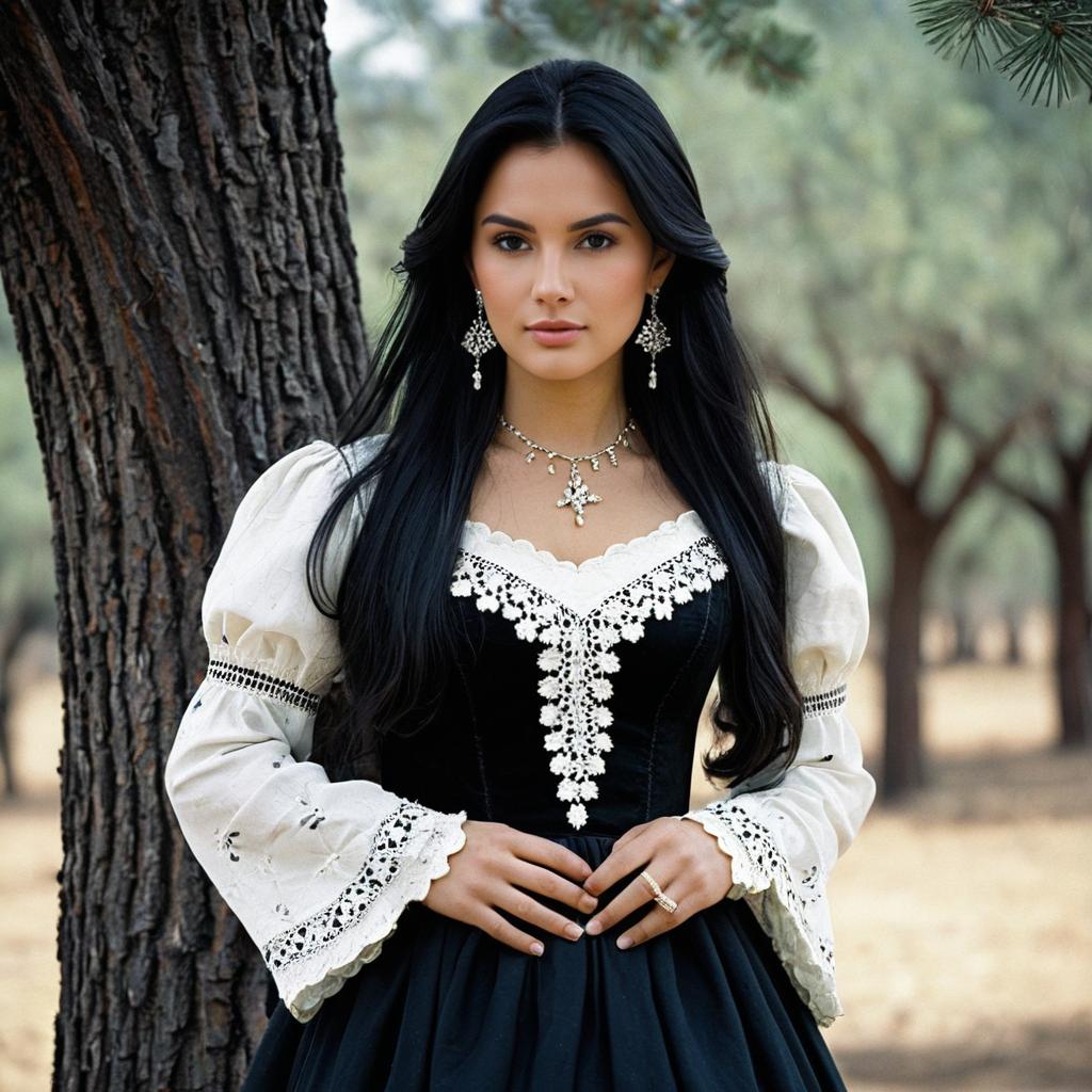 Country dance dress,1girl, solo, hands on own hips, long hair, jewelry, earrings, tree, skirt, full body, long skirt, multicolored clothes, black hair, outdoors, realistic, brown hair, dress, nature