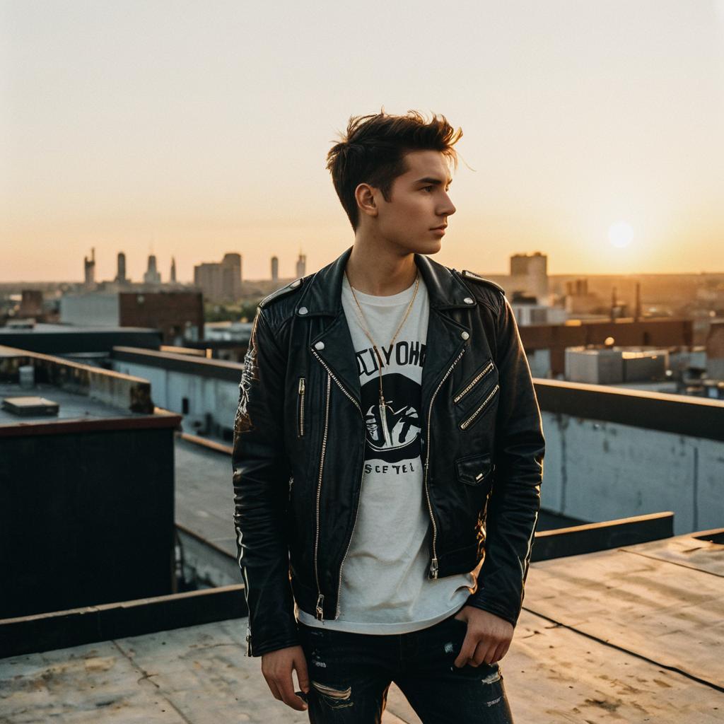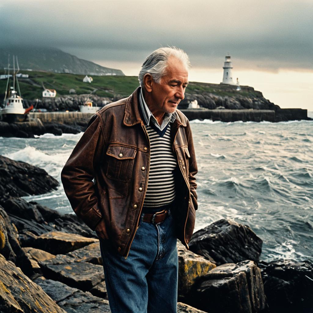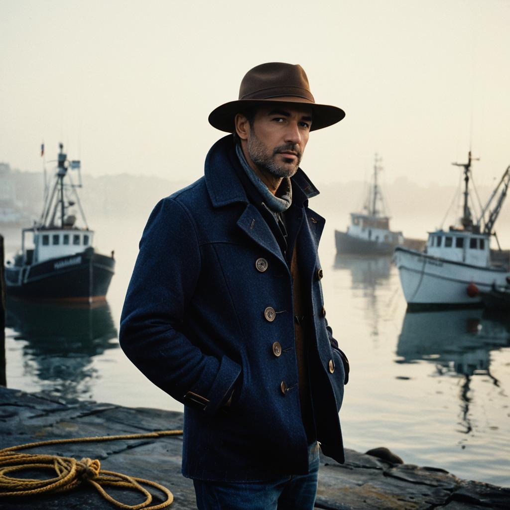 A curious child in a sunset harbor dock, wearing a weathered brown leather jacket with rolled-up denim jeans and a knit cap, captured in a cinematic wide shot with soft golden hour lighting and high-fidelity detail ––sref 1562