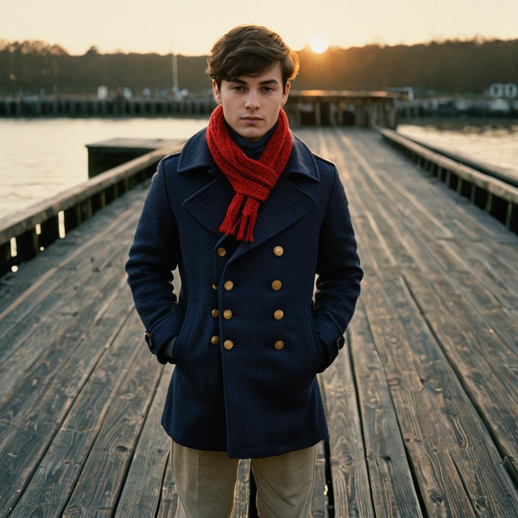 A young child standing on a wooden harbor dock during sunset, wearing a brown leather jacket, a patterned sweater, rolled-up denim jeans, and a brown knit cap. The background features moored boats and a calm water surface with soft golden hour lighting illuminating the scene.