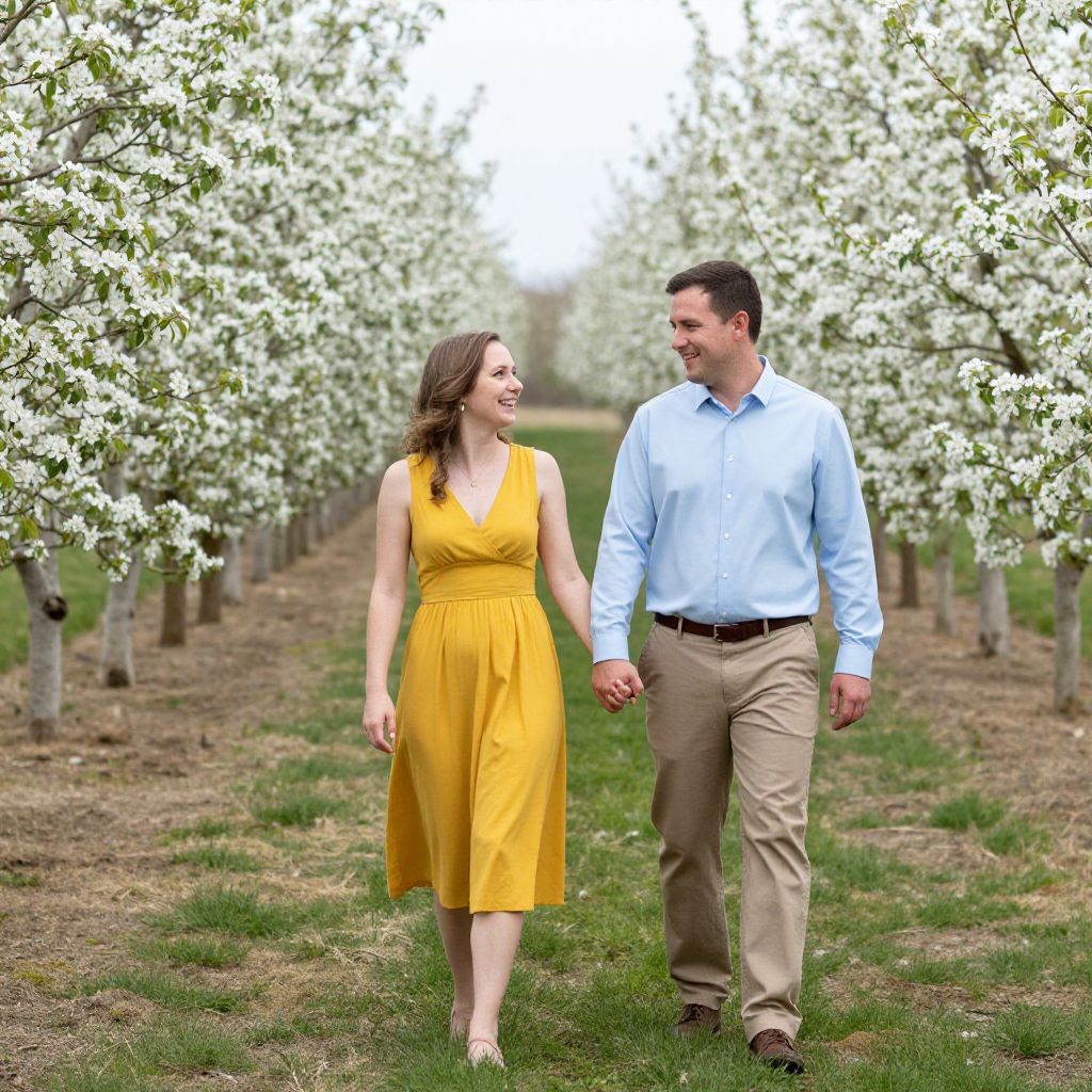 Two individuals share a joyful moment during a spring apple blossom engagement session at an orchard, captured by a Grand Rapids wedding photographer, with the woman wearing a mustard yellow dress and the man dressed in a light blue shirt and khaki pants, both exuding warmth and happiness as they walk hand-in-hand through rows of blooming trees.