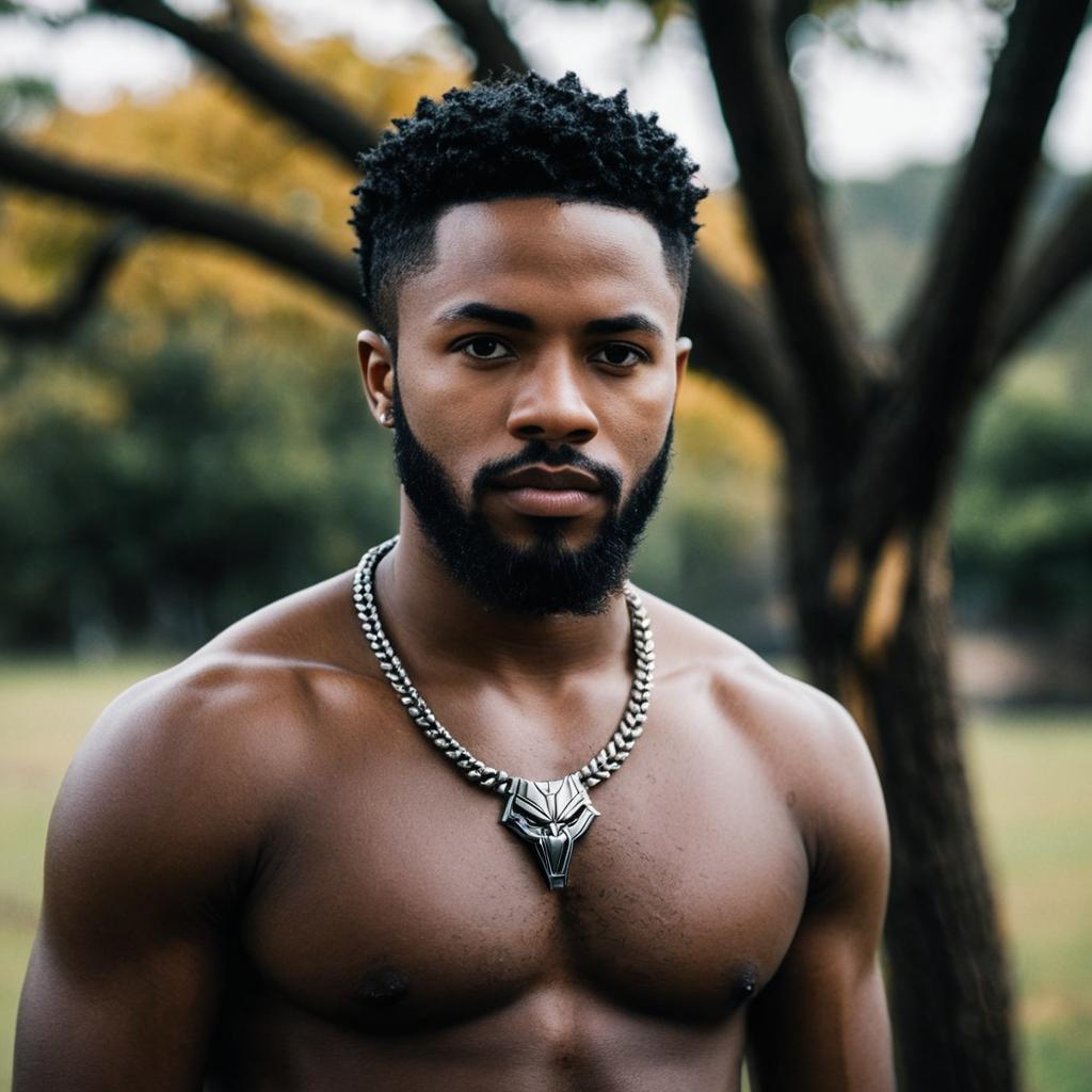 African outfit male dress,1boy, jewelry, solo, male focus, necklace, facial hair, black hair, earrings, dark-skinned male, bracelet, blurry, dark skin, blurry background, realistic, looking at viewer, outdoors, beard