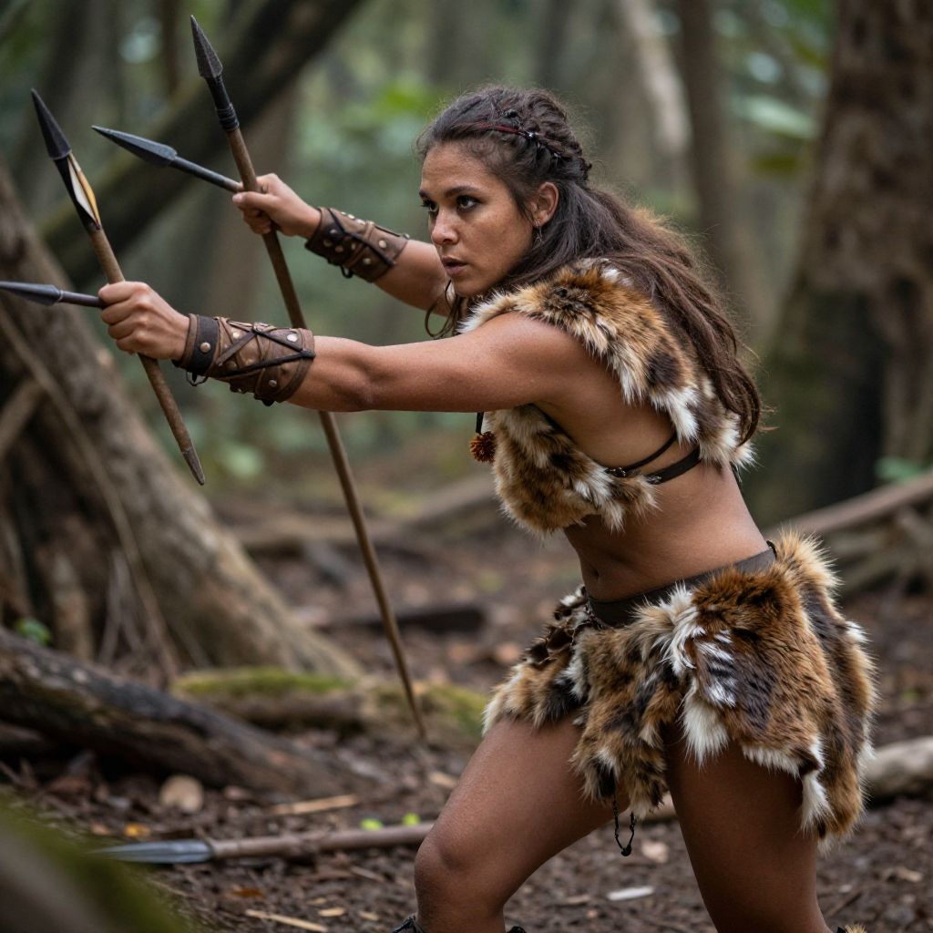 Photograph of a fierce, muscular woman with dark braided hair, standing in a dense forest. She wears a fur loincloth and matching arm bands, with leather straps holding multiple sharp, wooden spears. Her focused expression and forward stance suggest readiness for battle. The forest background features tall trees and a forest floor covered in leaves and dirt. Her fur clothing is brown with white and black patches, and her skin is a light brown tone. The lighting is natural, highlighting her determined demeanor.