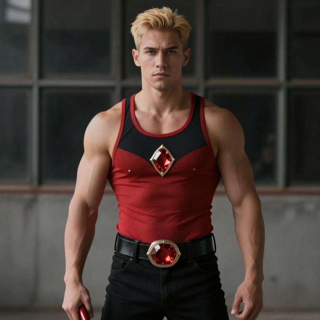 Photograph of a muscular man with short blonde hair, wearing a red and black tank top with a red gemstone design, black pants, and a large belt with a red emblem. He stands in front of a dark, industrial-looking window with metal frames, holding a red object in his right hand.