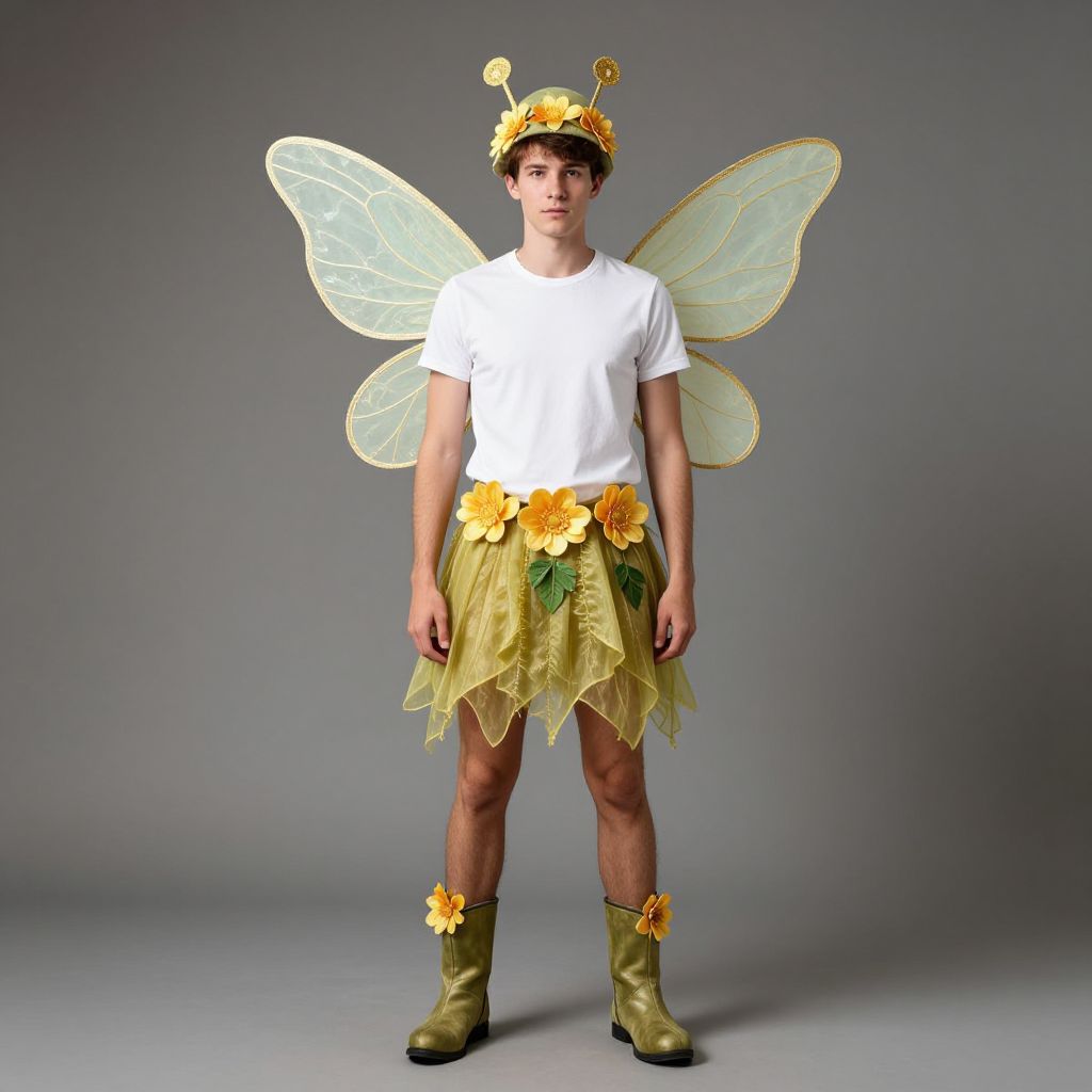 Photograph of a young man in a white shirt, yellow fairy costume with wings, flower headband, and green boots, standing against a gray background