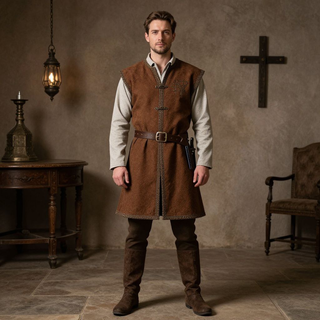 Medieval Outfit Costume, man in a brown vest and brown boots standing in a room