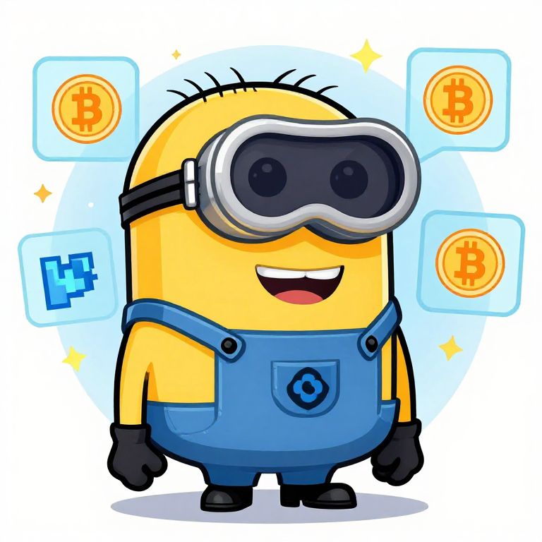 Minion NFT concept depicting a quirky, stylized minion wearing VR goggles, surrounded by floating holographic cryptocurrency symbols and pixel art icons, rendered in a clean vector style with bold colors and dynamic lighting effects.