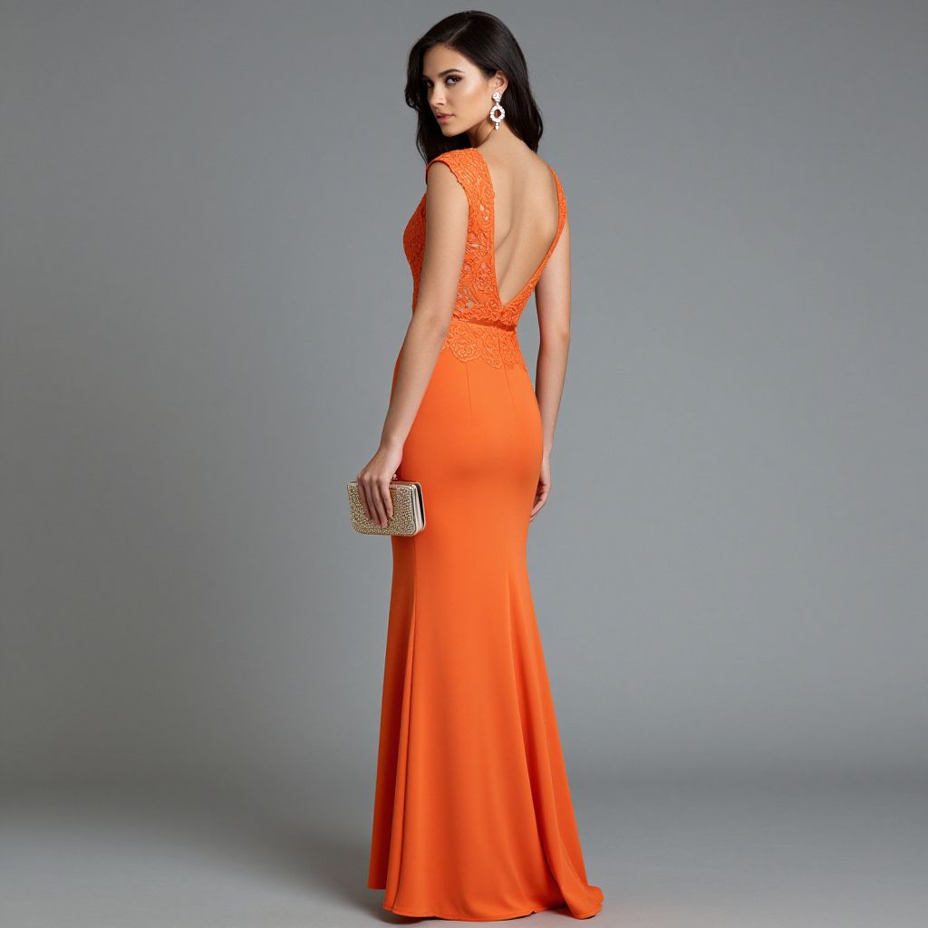 Elegant woman showcasing a vibrant orange floor-length evening dress featuring intricate lace detailing on the back, paired with a matching clutch and sparkling earrings, exuding sophistication and grace.