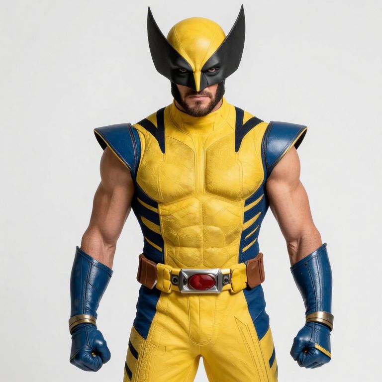 Wolverine Replica, wolverine in a yellow and blue outfit posing for a photo