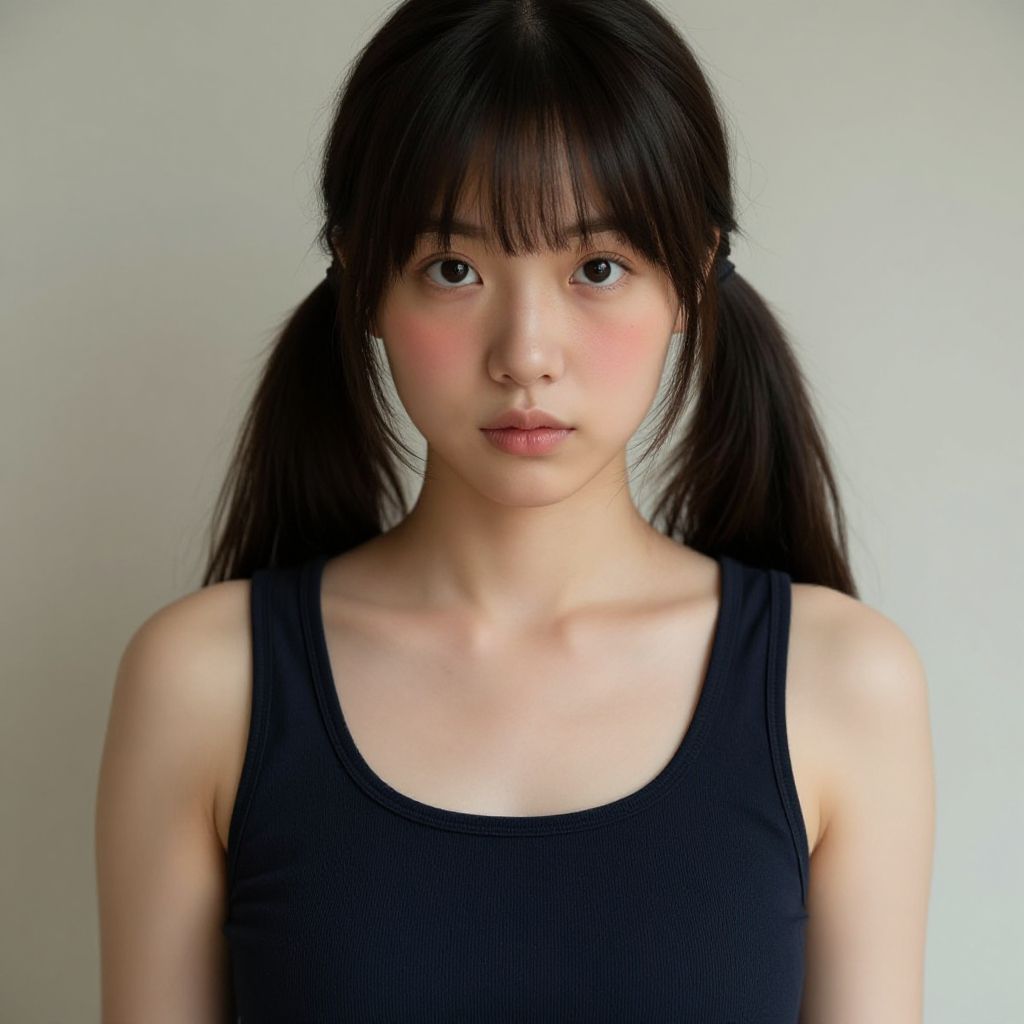 Photograph of an Asian woman with long black hair and fair skin standing in a basketball gym. She wears a black sleeveless athletic dress with white trim, and black shorts with white stripes. Her expression is neutral, and she stands centered in front of a blue basketball court with wooden flooring. The background includes a white and dark gray wall, a blue basketball hoop with a white net, and a black bag on the left. The lighting is natural, and the image has a slight CGI-like quality.