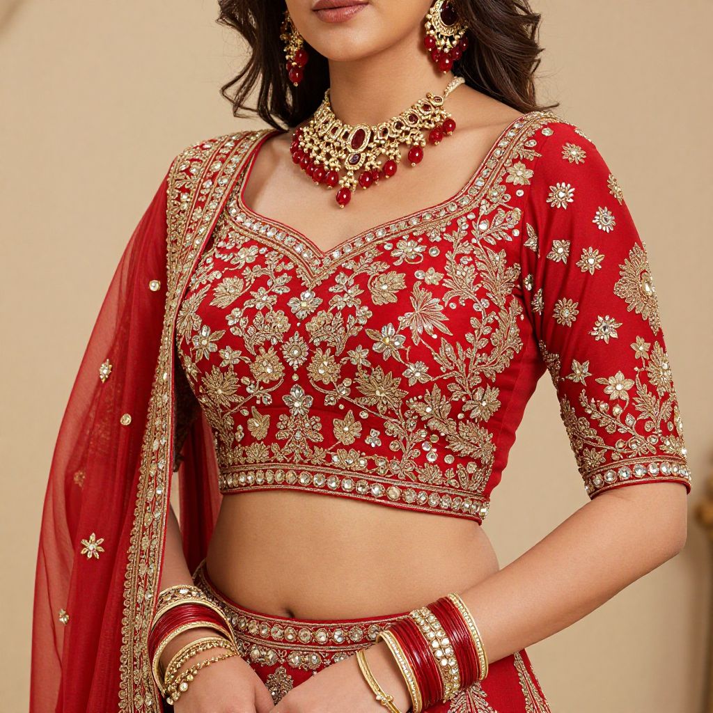 Woman wearing a vibrant red embroidered kalidar lehenga blouse adorned with intricate floral patterns, crystal embellishments, and gold threadwork, complemented by matching jewelry including a beaded necklace and earrings.