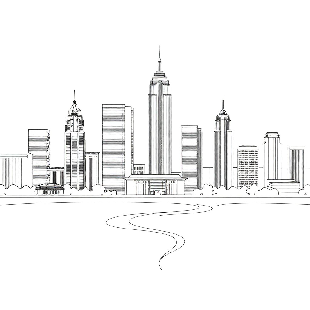 Single line art generator rendering detailed continuous line cityscapes featuring simple architectural shapes and flowing lines, balance of complexity and minimalism, smooth monochromatic artwork for contemporary design and visual storytelling.