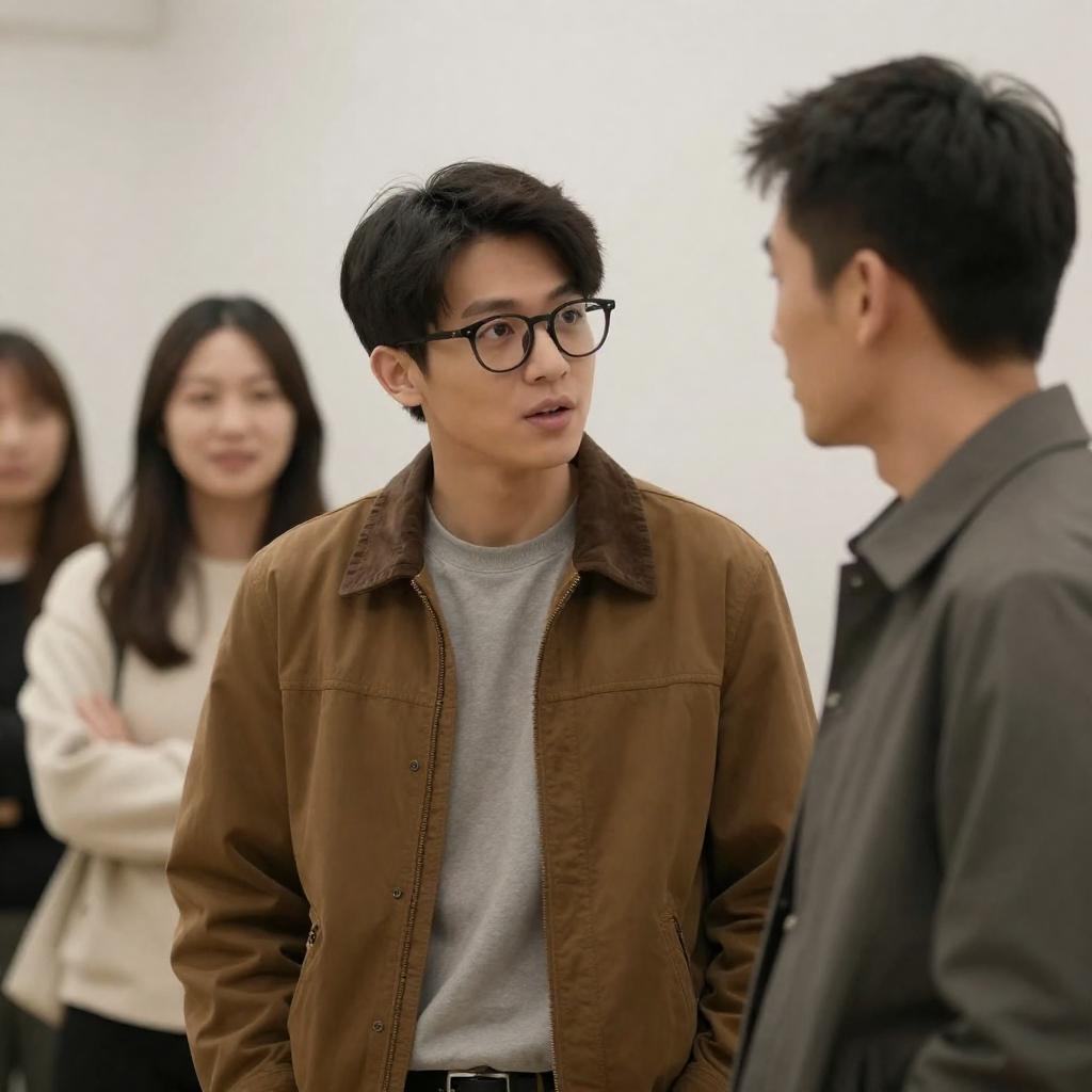 A group of diverse teenagers standing outdoors in a forest during daytime. The central figure is a smiling young Asian man wearing a grey jacket over a black shirt with a white 'V'. Surrounding him are boys and girls with varied expressions, dressed in casual clothing including hoodies, jackets, and sweaters. In the background, there is a wooden cabin surrounded by tall trees, with warm sunlight filtering through the foliage.