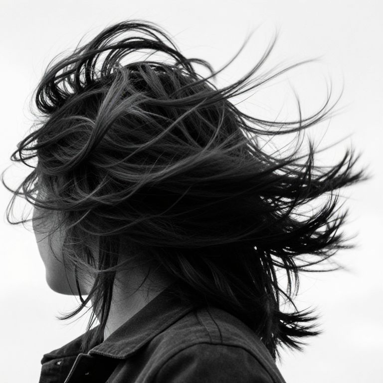 This is a black-and-white photograph of a person's profile, focusing on their wild, flowing dark hair that appears to be in motion. The person's face is partially obscured by the hair, which is blowing to the right. They are wearing a dark, textured jacket. The background is completely white, making the subject stand out starkly. The photograph has high contrast, emphasizing the texture of the hair and the fabric of the jacket. The overall style is dramatic and dynamic, capturing a sense of movement and energy.