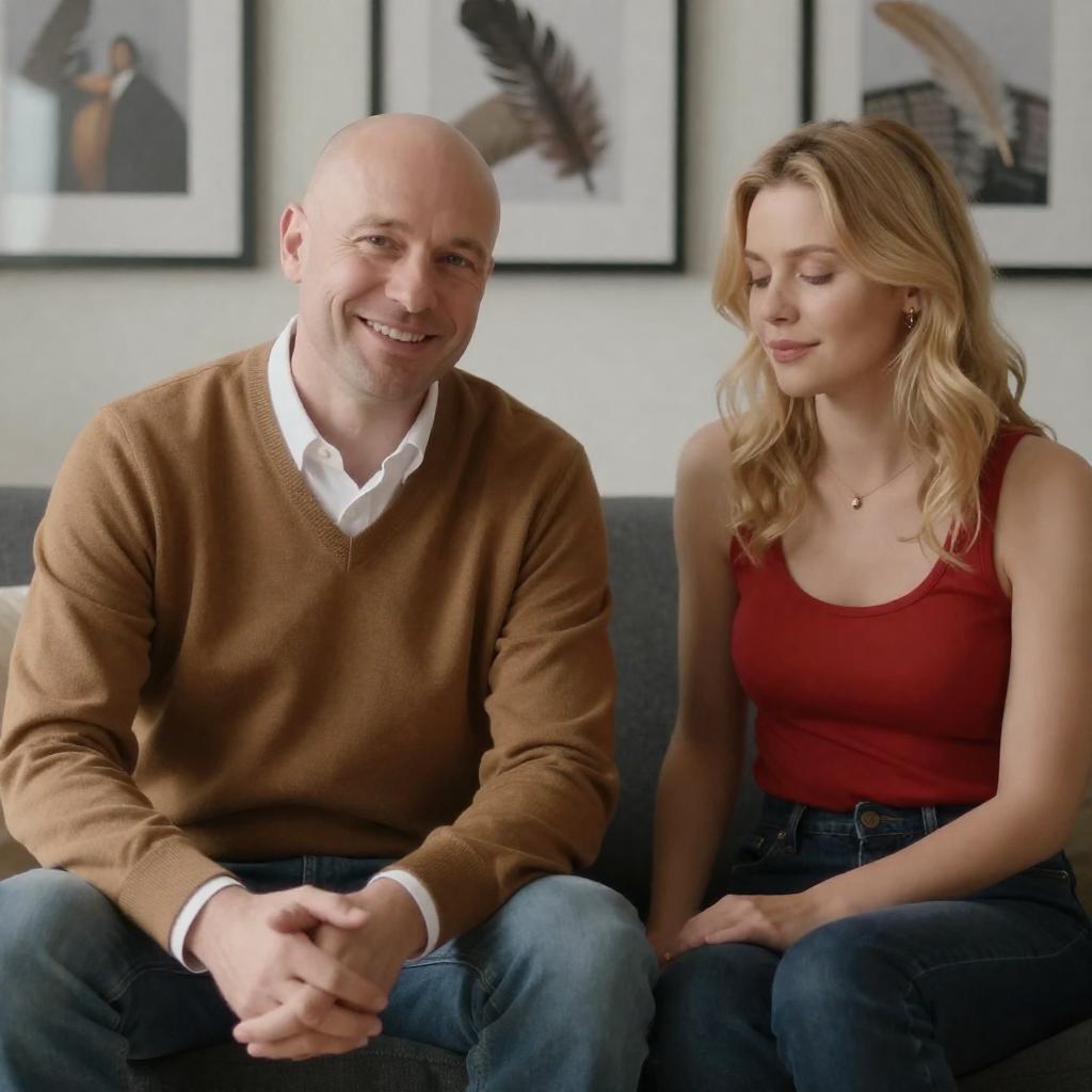 Photograph of two people sitting on a dark couch. Bald man in brown sweater over white shirt, smiling. Blonde woman in red tank top, looking down. Blurred background with framed photos and feathers. Man on left, woman on right.