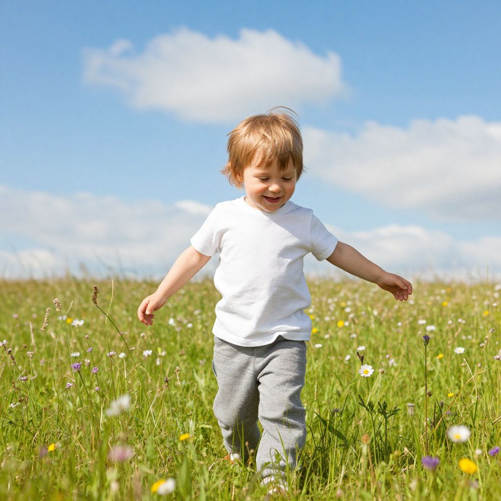 A young boy with brown hair, bright green eyes, and a slightly mischievous smile, wearing a green helmet with a red visor and a vibrant striped shirt in blue and white, paired with a yellow vest that adds a playful touch to his outfit. He stands in a sunny meadow, surrounded by tall grass and blooming flowers, looking directly at the camera with curiosity and energy.