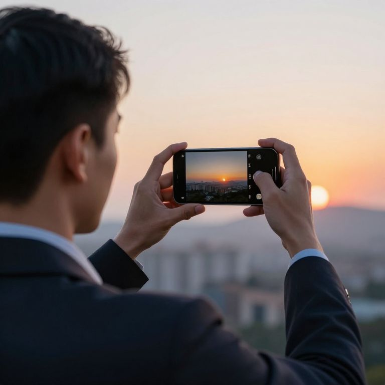 A young professional holding a smartphone, taking a photo of a sunset, emphasizing the intersection of technology gadgets and art.