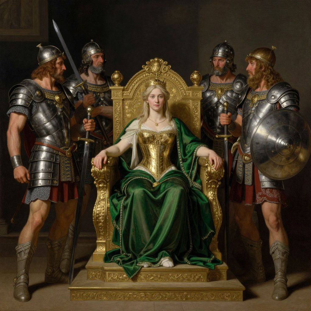 The image depicts a grand and ornate scene featuring a woman seated on a large, intricately carved throne, exuding regal authority. She is adorned in a golden corset and a crown, with flowing green robes that cascade down the sides of the throne. Surrounding her are four muscular warriors, each dressed in elaborate armor and holding various weapons, including swords and shields. The warriors are positioned in a semi-circle, with two on either side of the throne and one behind it, creating a protective and imposing presence. The background is dark and muted, allowing the figures and the throne to stand out prominently. The overall composition is balanced and symmetrical, with the woman at the center, flanked by the warriors, and the throne as the focal point. The scene is rich in classical realism, with detailed textures and realistic proportions, and is reminiscent of the works of artists like Rembrandt, William-Adolphe Bouguereau, and Arthur Rackham, blending elements of contemporary illustration with classical realism.