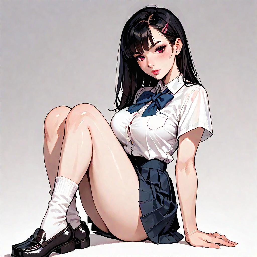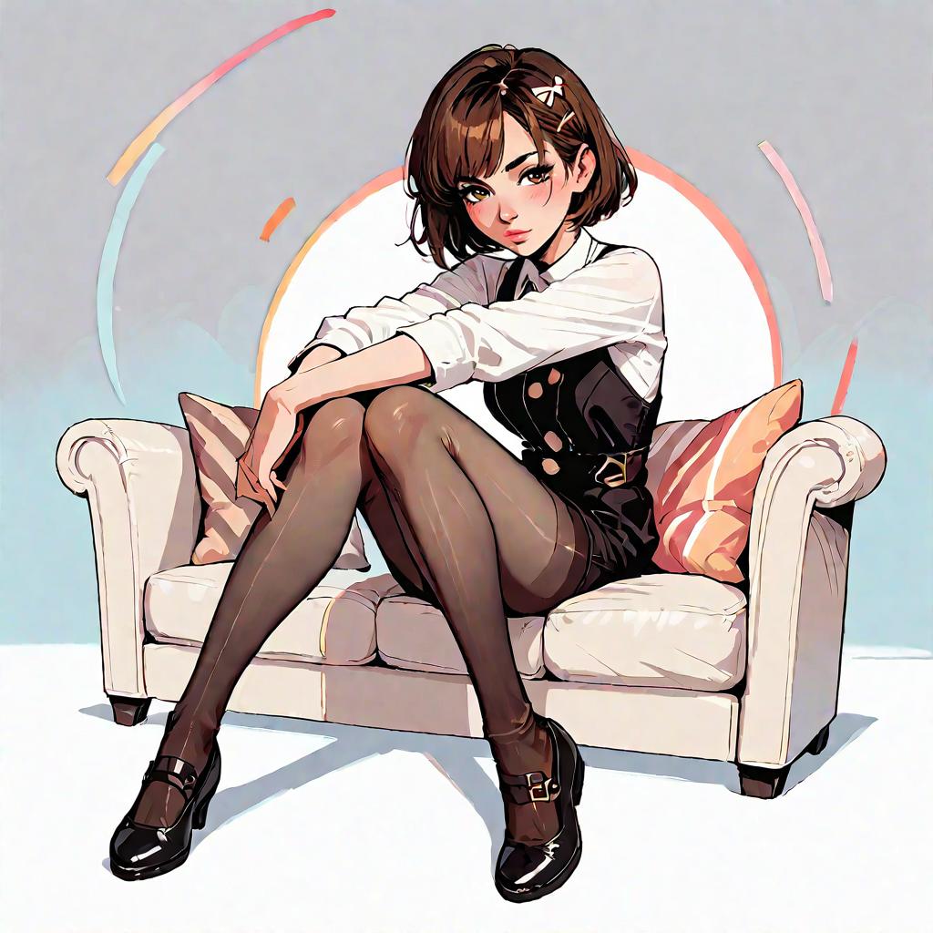 Brown_hair, short_hair, brown_eyes, 1girl, solo, hair_bow, pantyhose, wearing a minidress, sitting on a sofa, legs together, full body, score_9, score_8_up, score_7_up, anime coloring, source_anime, anime