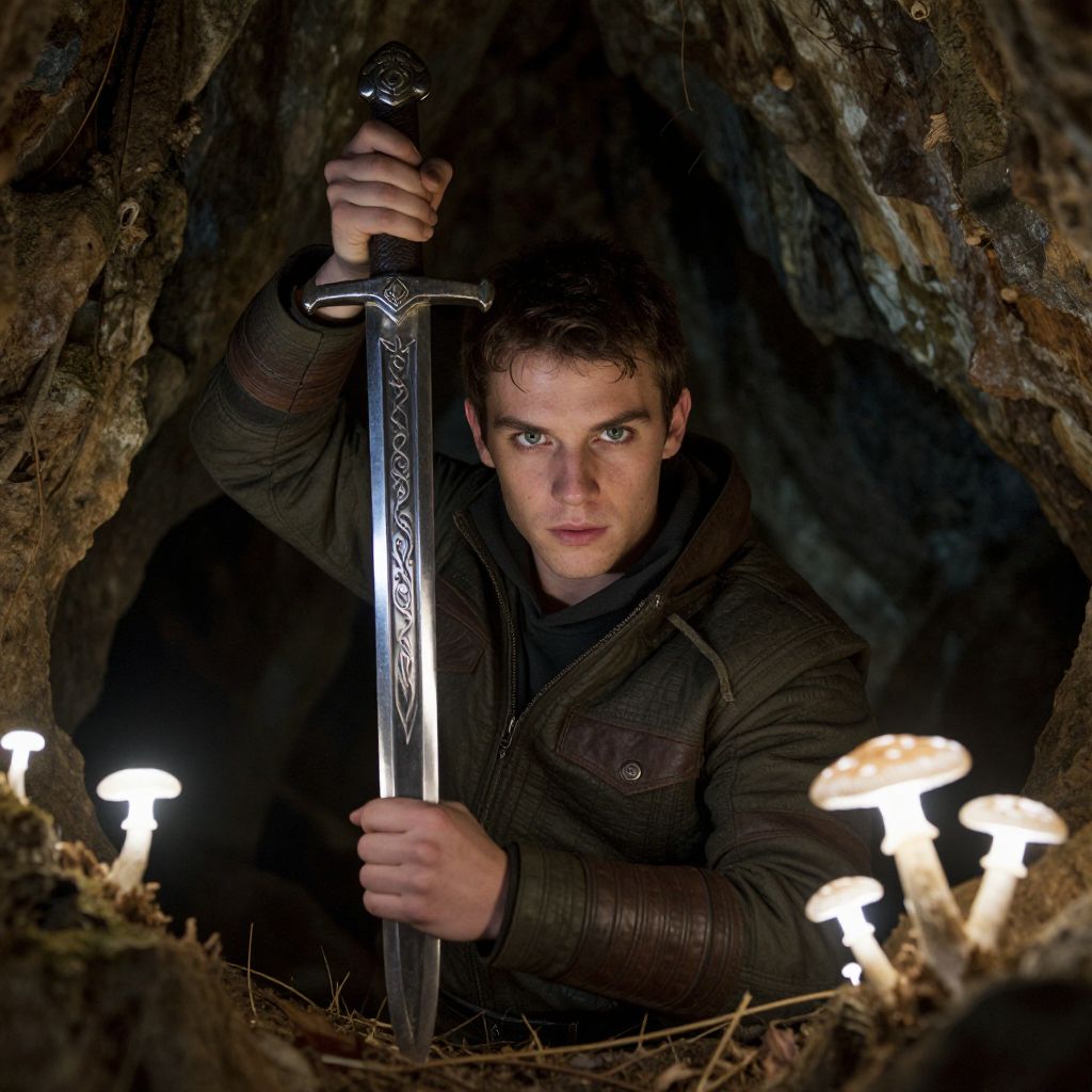 A realistic photographic composition showing a lone figure in a forested cave, a young man with a focused expression and intense green eyes, holding an orante sword with intricate engravings, the sword reflecting the soft glow of bioluminescent mushrooms around him, casting subtle light on the cave walls.