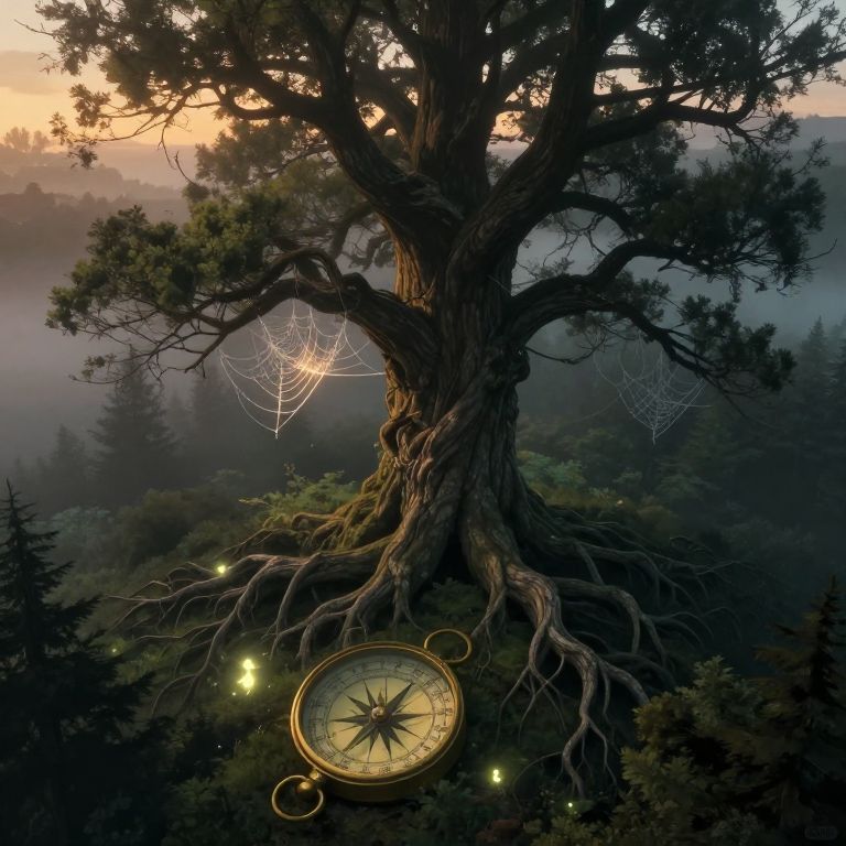 A tranquil yet eerie digital artwork evokes the mystical landscapes of Studio Ghibli films, portraying an isolated, age-old tree standing within the foggy heart of an enchanted forest at dusk. From an aerial viewpoint, observe its sprawling, twisted roots and branches shrouded in glistening cobwebs that reflect the golden hour light. In the foreground, tiny glowing spirits flutter around a partially submerged, vintage brass compass, infusing the scene with a sense of enchanting discovery and forgotten exploration, while the faint, distant echo of an enigmatic tune lingers in the air.