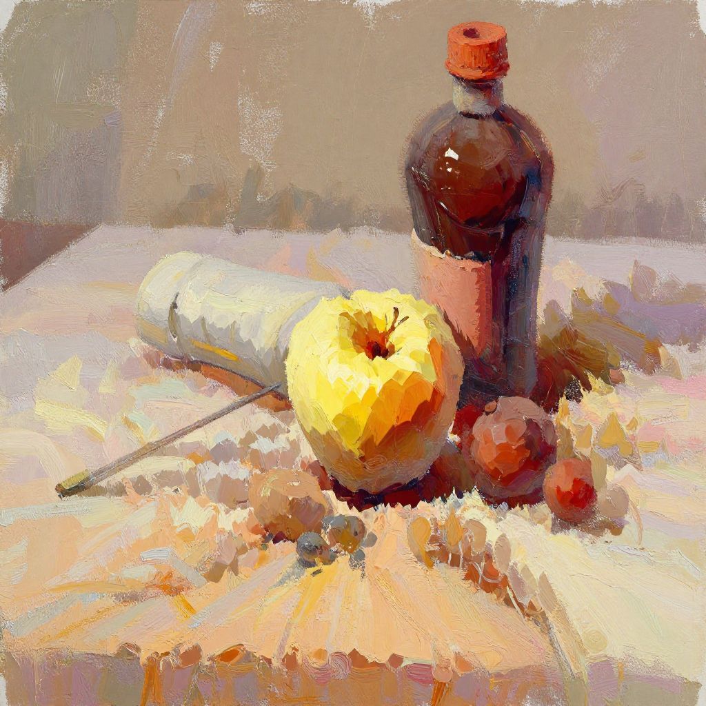 Still life with an unsettling color palette of muted greens and rusty reds, decaying fruit and broken glass, painterly style, dramatic shadows and intense texture focus