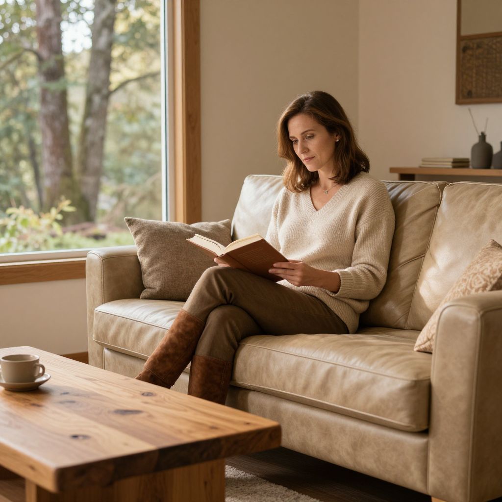 A warm, sunlit interior room with a cozy living area featuring a leather sofa in beige and brown tones, a wooden coffee table with natural grain, and a large window showing a forest outside. A middle-aged woman with kind eyes, soft brown hair, and a neutral face sits reading a book on the sofa, wearing a beige sweater and brown boots.