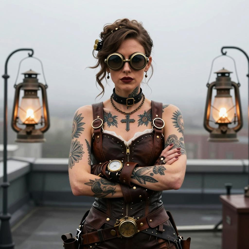A confident woman dressed in steampunk attire stands with her arms crossed against a misty rooftop backdrop illuminated by vintage lanterns. Her detailed tattoos, leather accessories, and brass goggles emphasize the distinctive steampunk style, blending Victorian fashion with industrial elements.
