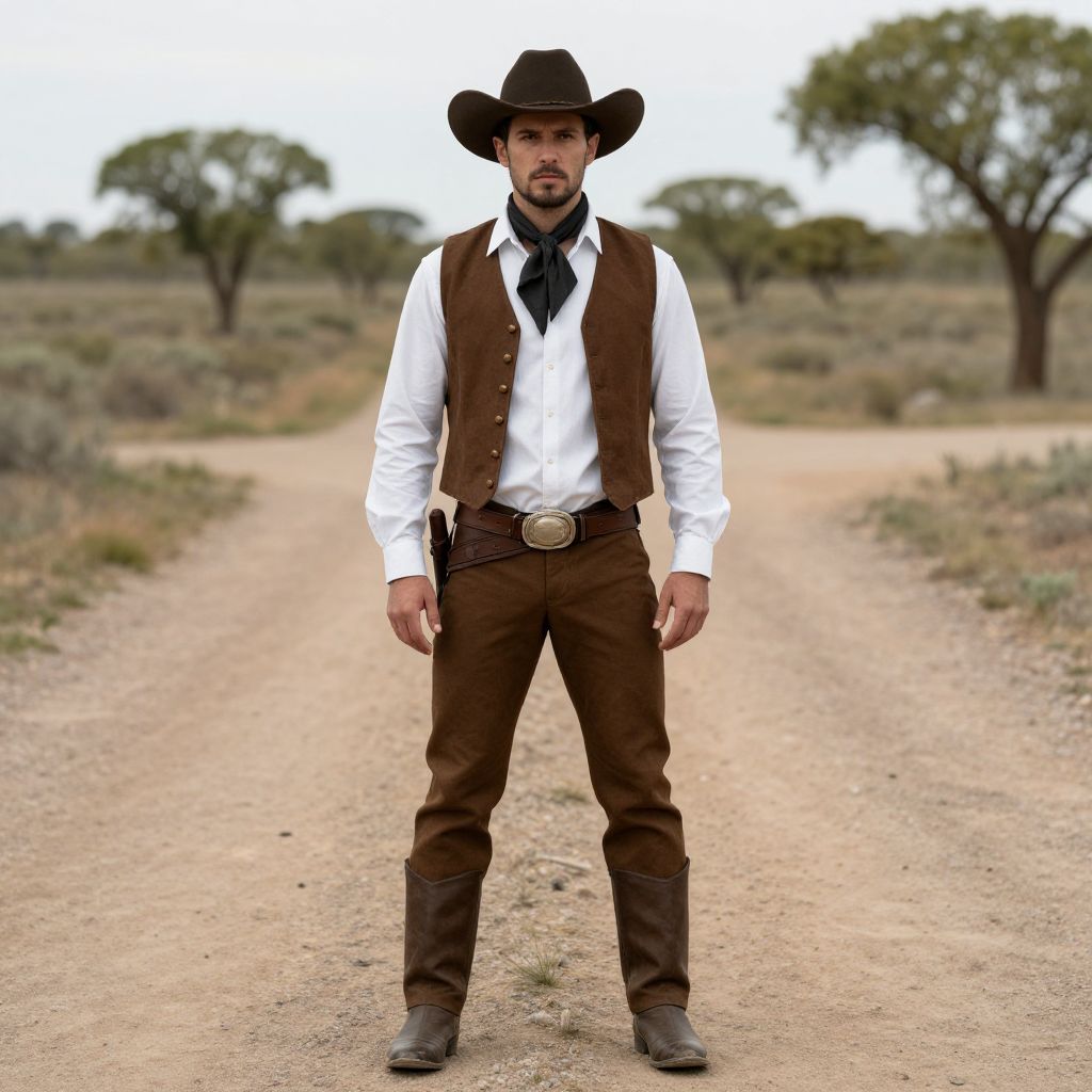 Photograph of a white man standing on a dusty, dirt road in a desert landscape with sparse trees. He has a light beard and wears a black cowboy hat, white dress shirt, brown vest, and matching brown pants with a black belt and silver buckle. His black neckerchief is tied loosely. He has a black holster with a gun on his right hip. The background shows a blurred, dry, and tree-filled horizon. The man's stance is confident, with hands relaxed by his sides. The overall style evokes a classic Western cowboy look.