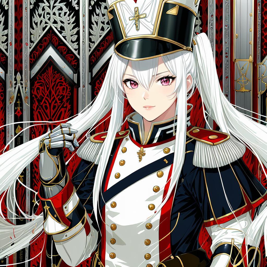 Digital anime-style illustration of a young female character with very long white twin-tailed hair and red eyes. She is wearing a detailed military uniform with gold buttons, epaulettes, gauntlets, and a high collar. The uniform includes a distinctive black, white, and red color scheme, complemented by a black and white shako cap adorned with gold accents. The background features ornate metallic and red decorative panels, adding a regal and formal atmosphere.