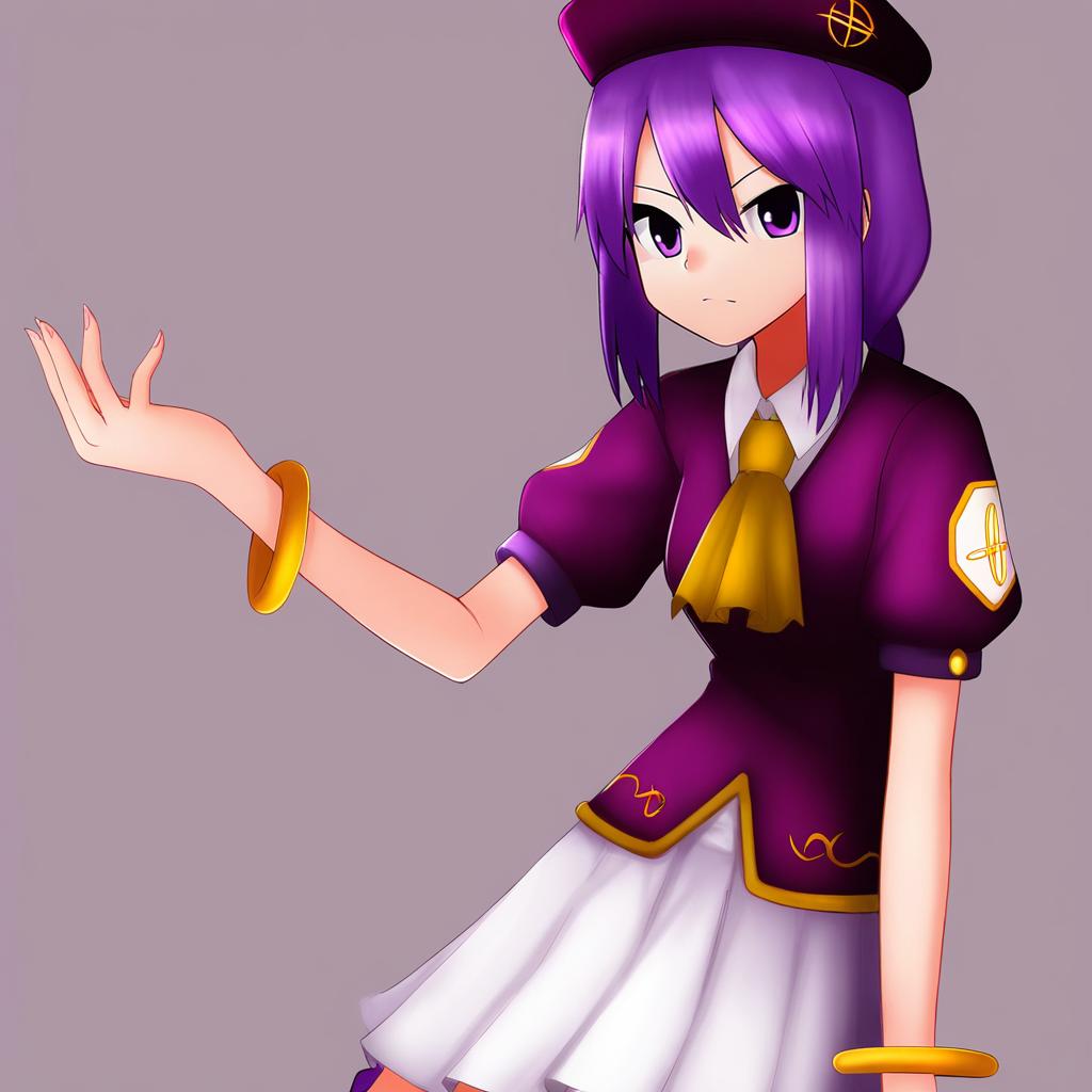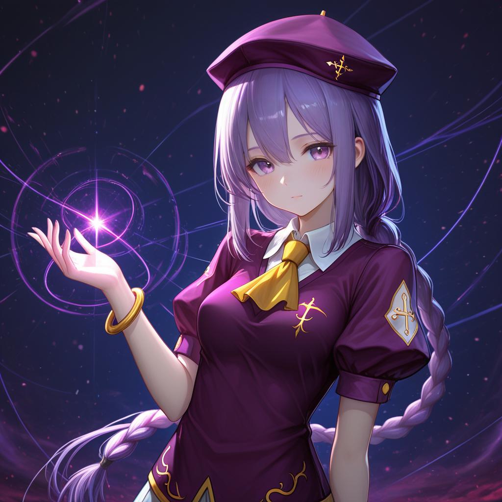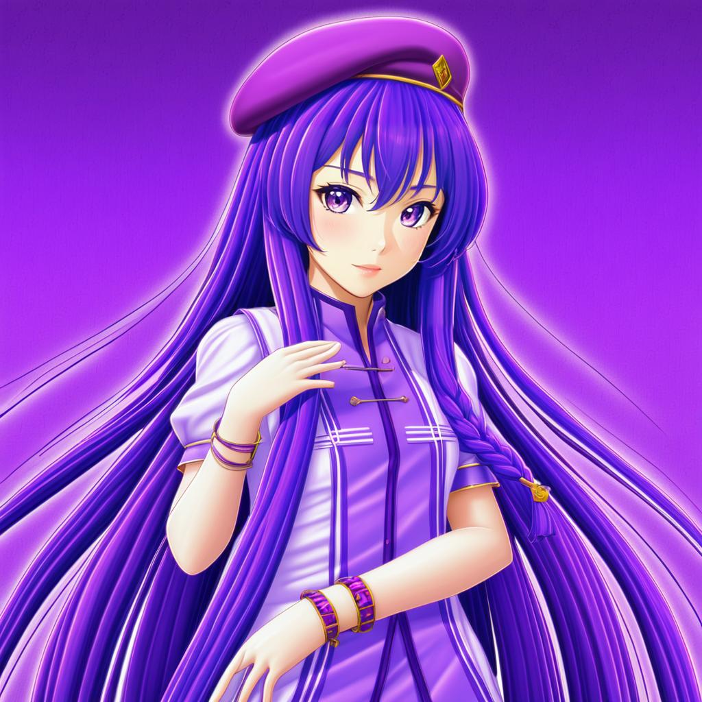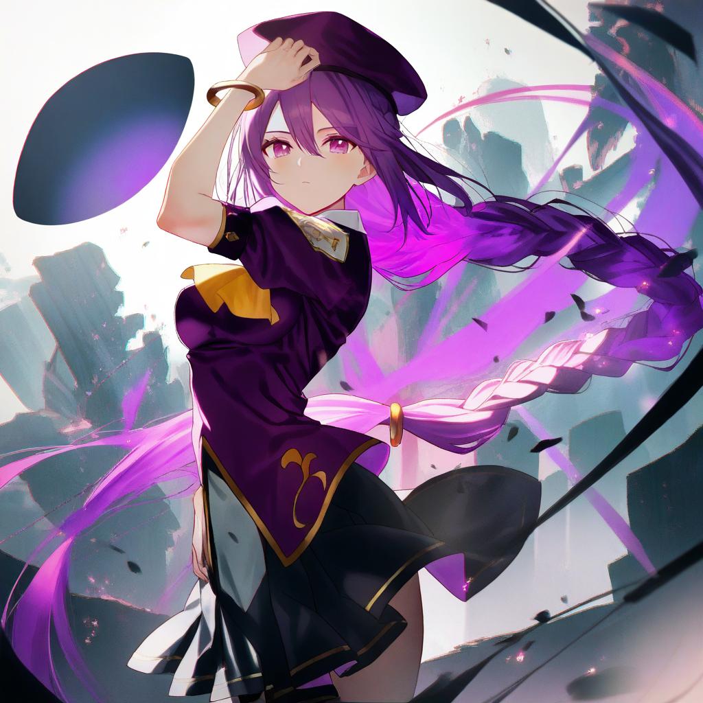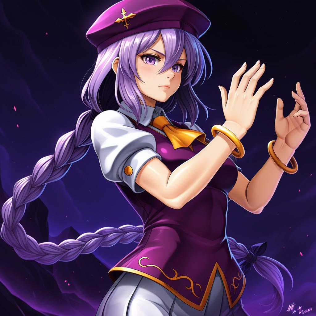 Sion eltnam atlasia, tsukihime, 1girl, purple eyes, purple hair, very long hair, long hair, single braid, bracelet, beret, by artist vilde loh hocen, dark_illustrious