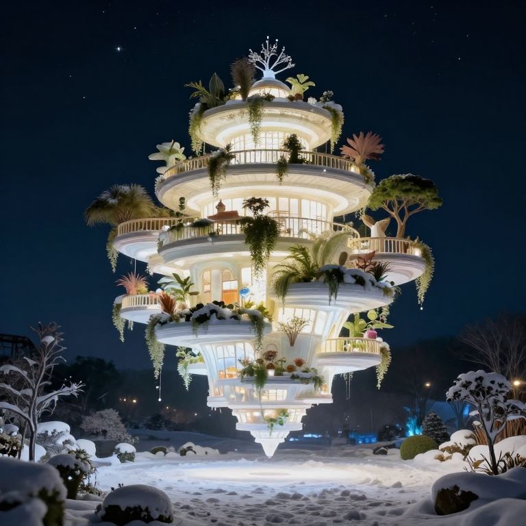 Photograph of a futuristic, multi-tiered floating building at night, illuminated with warm white lights. The structure is adorned with lush green plants and colorful flowers on each circular balcony. Snow blankets the ground and trees surrounding the building, with star-filled, dark blue sky above. The building's lights cast a soft glow on the snow, creating a magical, ethereal atmosphere. The architecture combines modern and whimsical elements, with sleek lines and an organic, almost tree-like appearance. The scene is serene and otherworldly.