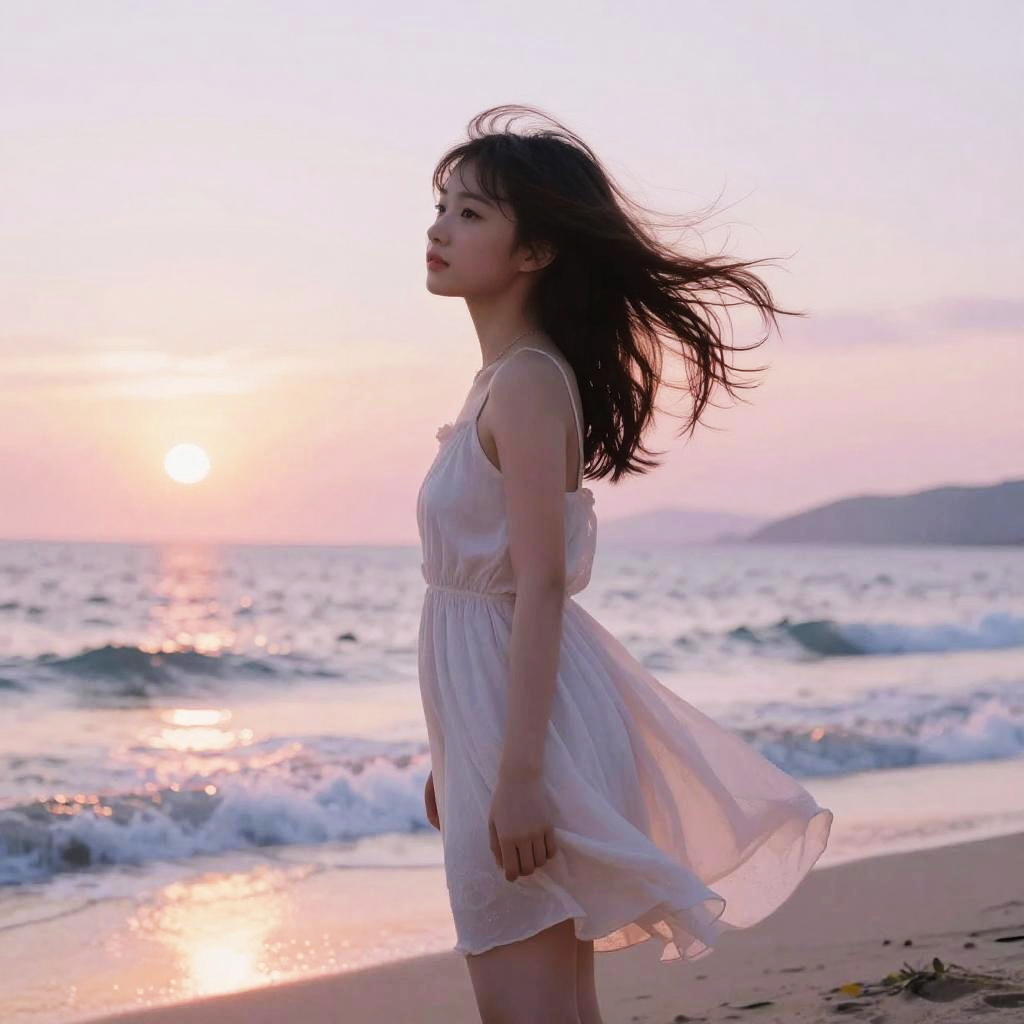 Fluffy hair anime girl with wind-blown hair, wearing a flowing summer dress, standing on a beach at sunset, pastel sky, sparkling ocean waves, soft and dreamy ambiance.